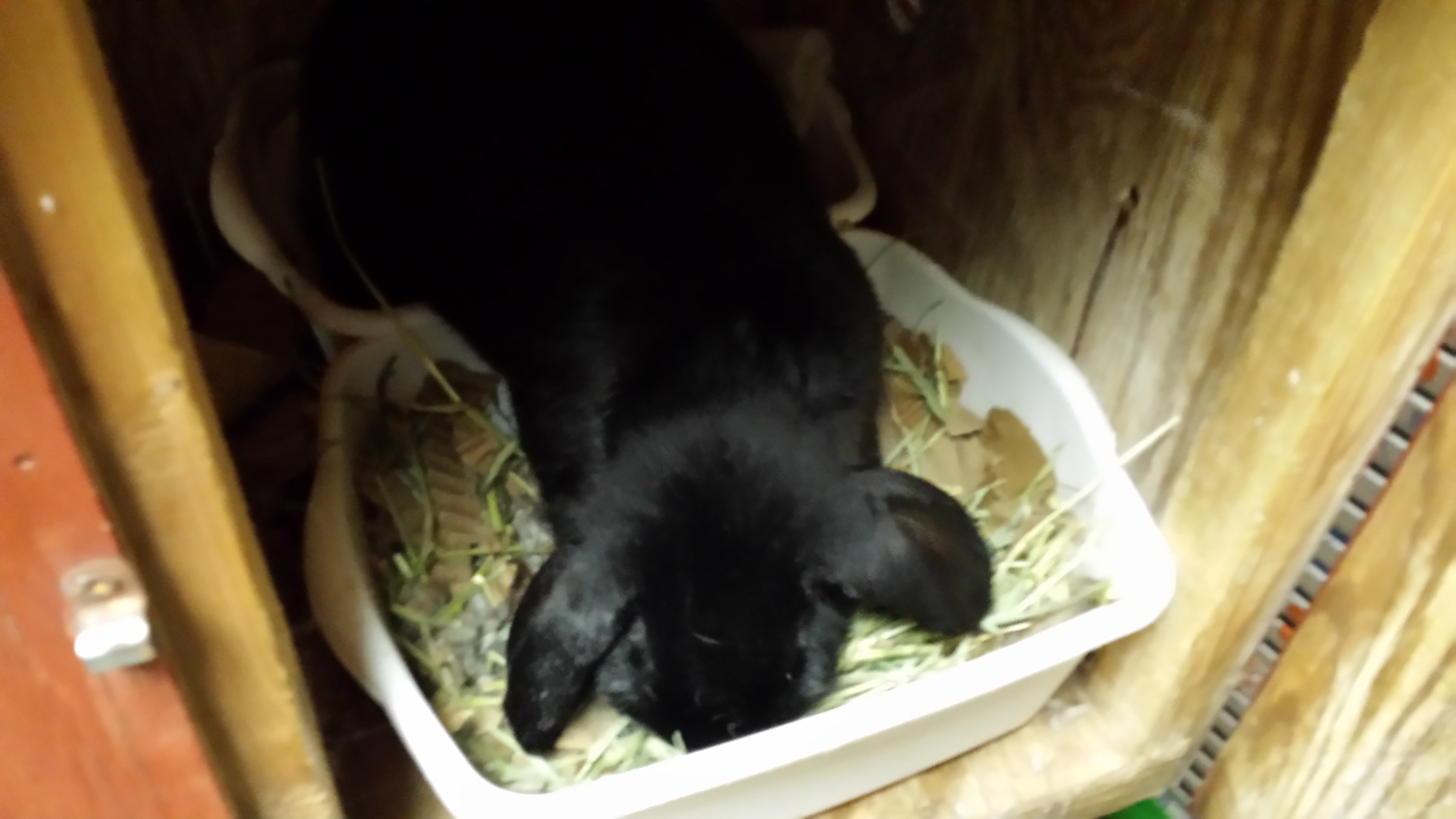 A tornado of activity has hit the bunny room in the basement. Charlotte, the female, is hauling every scrap of straw and blanket into the hutch. She is moving so fast, I can’t even get a clear photo of her. She’s a blur of fur!