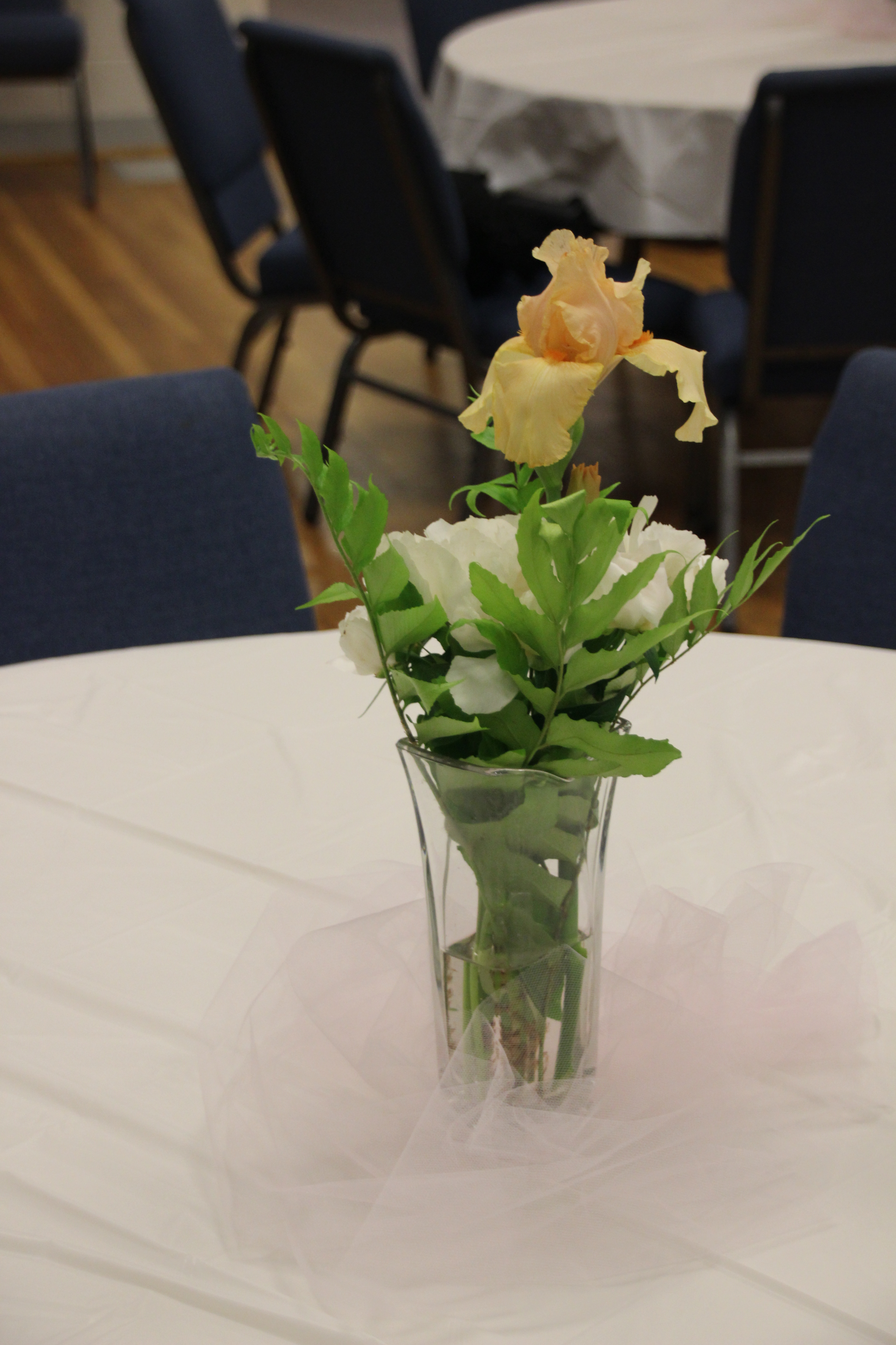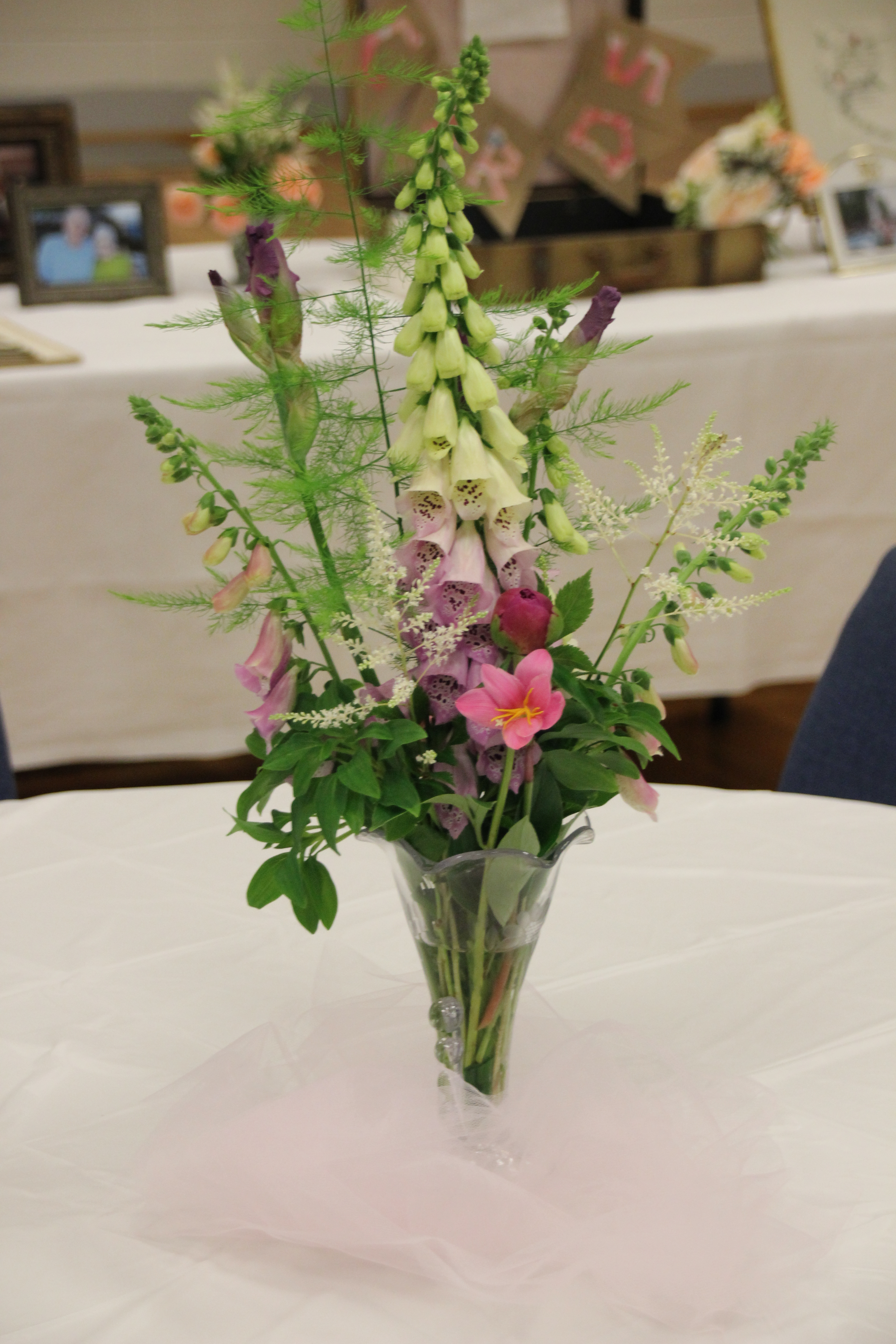 The vases sat on guest tables in clouds of pink or peach tulle.