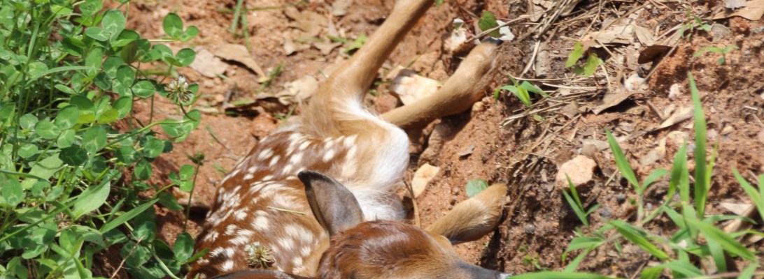 A tiny fawn was discovered in one of my ditches at around 2:00 PM in the hot sun.