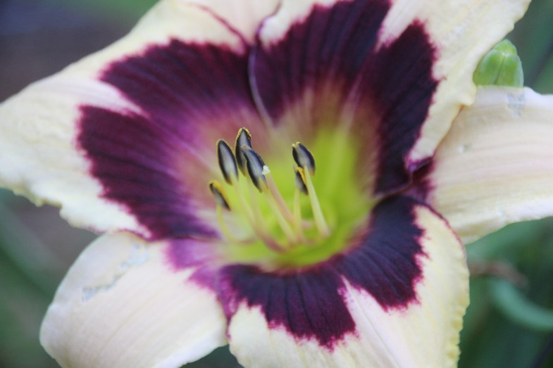 It has smooth moonlight yellow petals and a deep mulberry eye contrasted by a yellow-green throat.