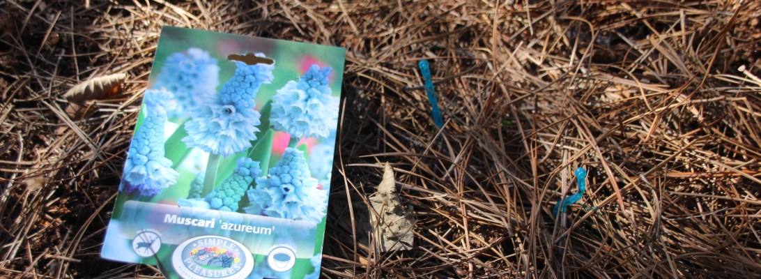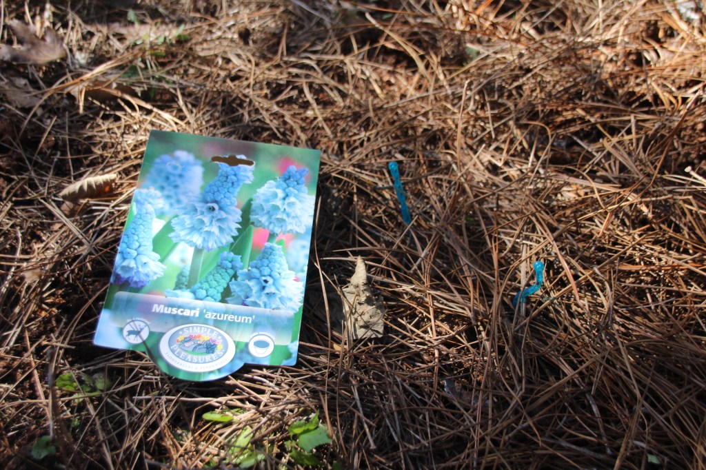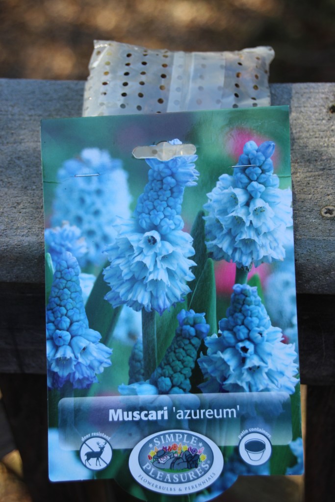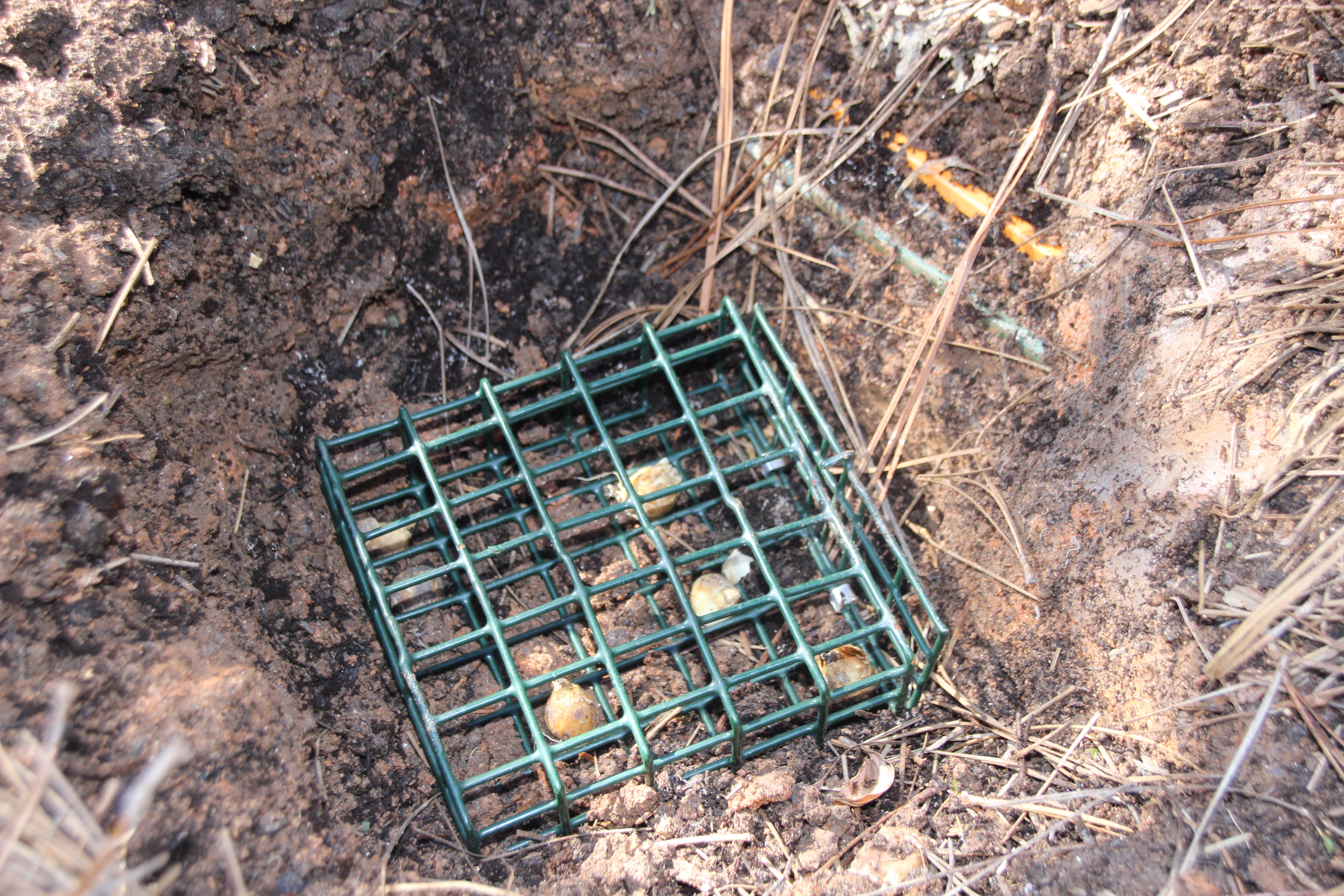 I have put these Muscari azureum bulbs in a protective basket (suet feeder).