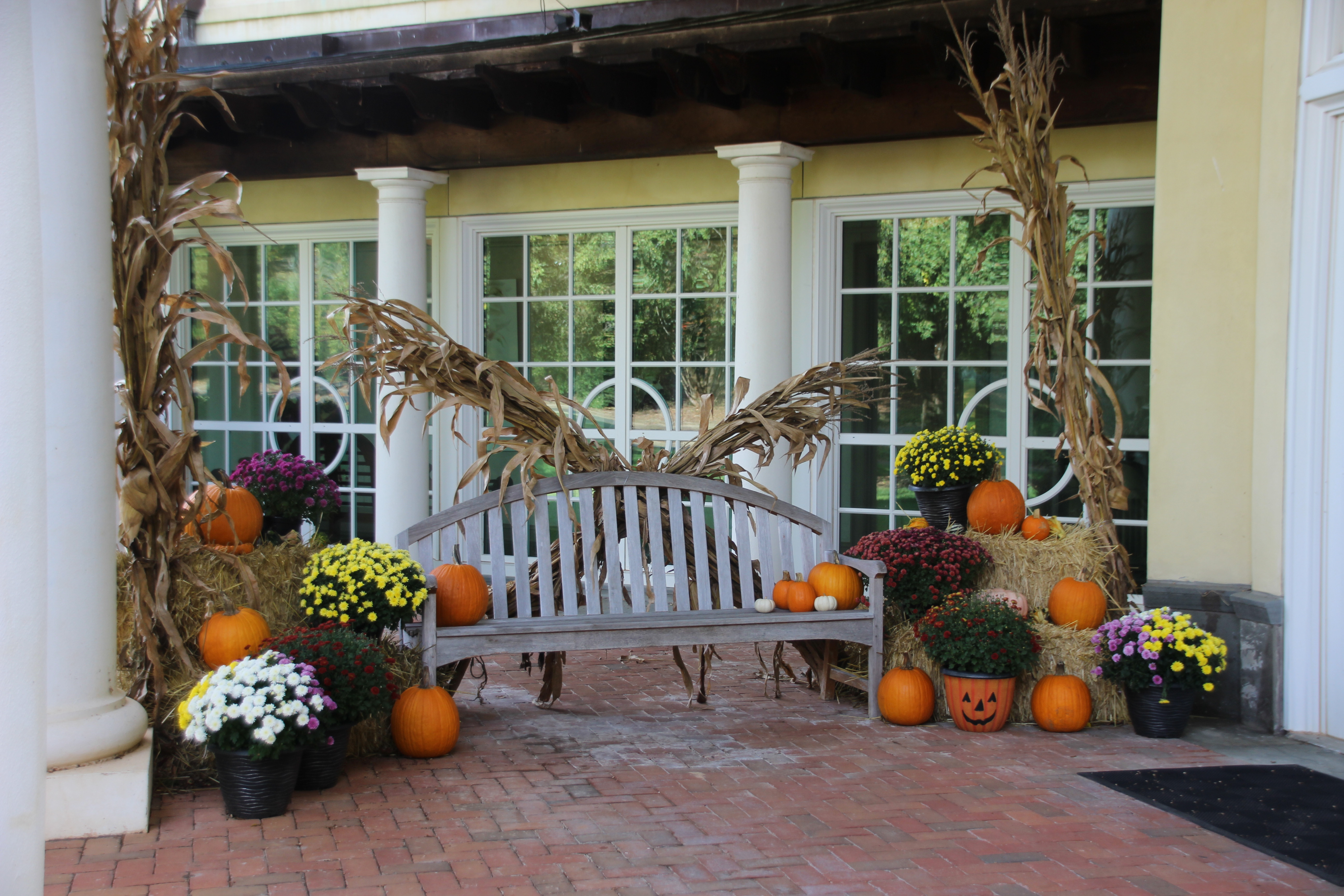 Fall has its own decor. It includes dried hay and corn stalks, yellow and orange mums, pumpkins and gourds.