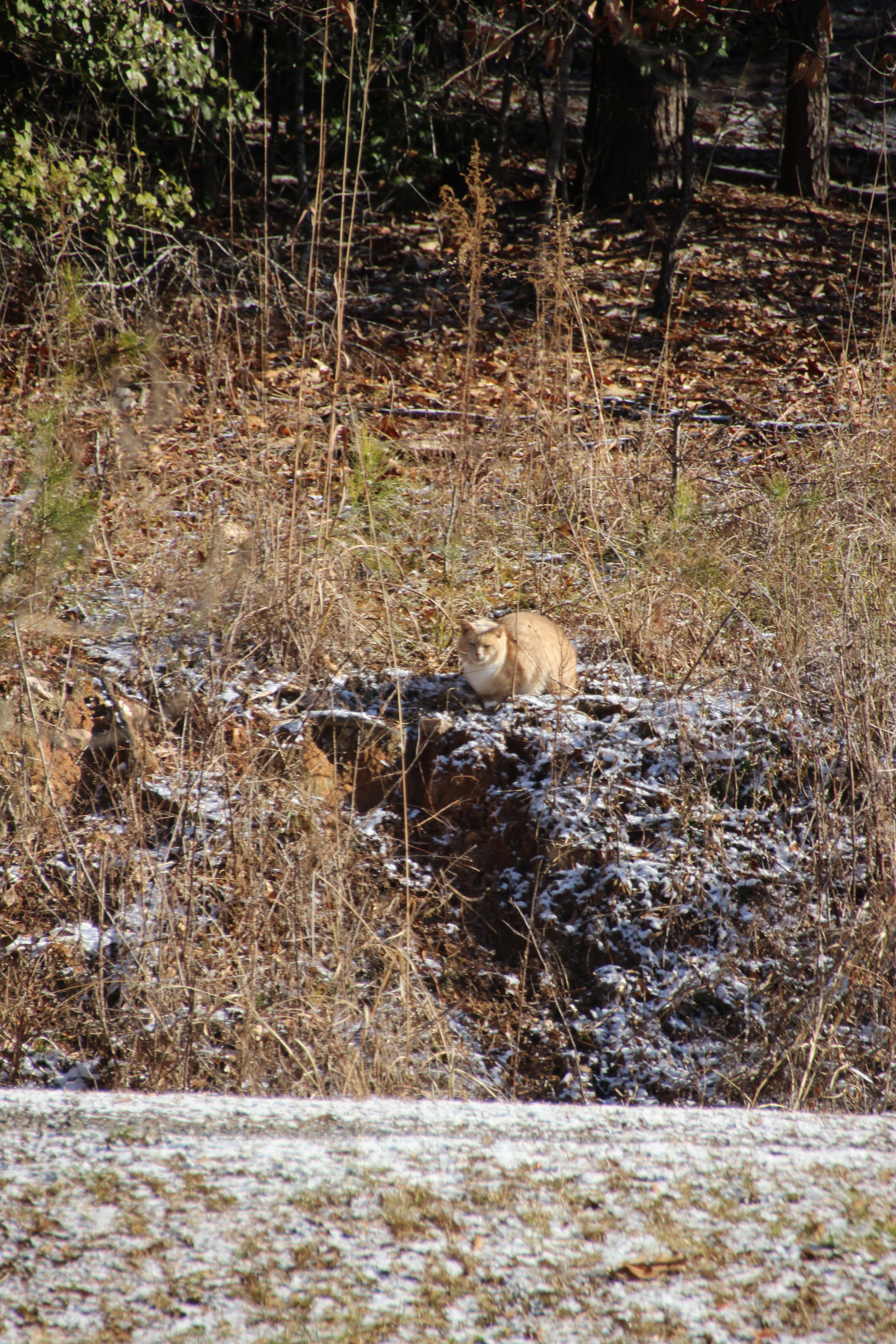 The birds told me it was around. They did not like its quiet presence. It was hunched up at the top of the bank where there seems to be a little path for small animals. It was watching and waiting. At first I thought it was a big, dirty rock of white quartz.