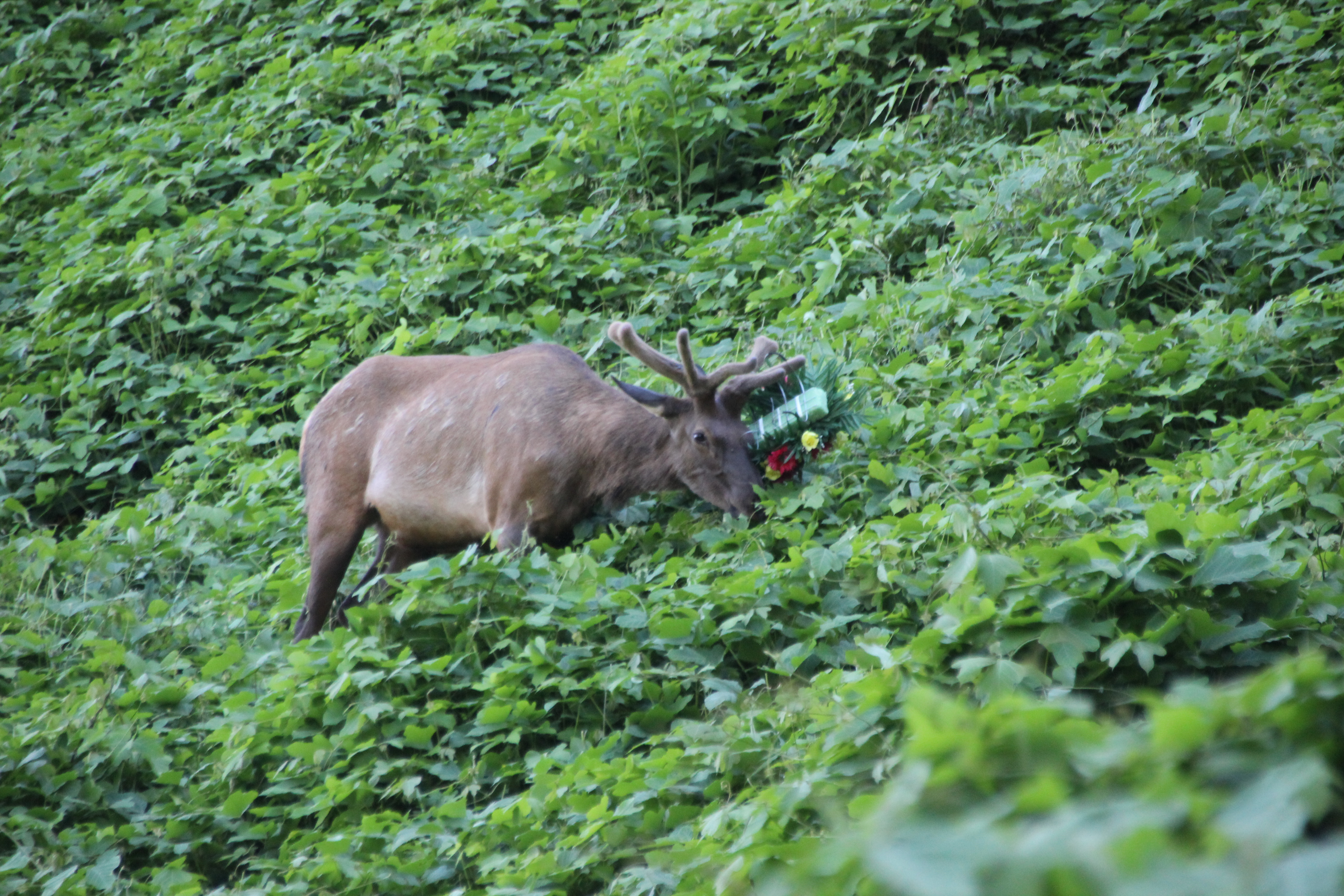Here is an elk by the side of a busy highway eating Kudzu with a fake wreath stuck on an antler.