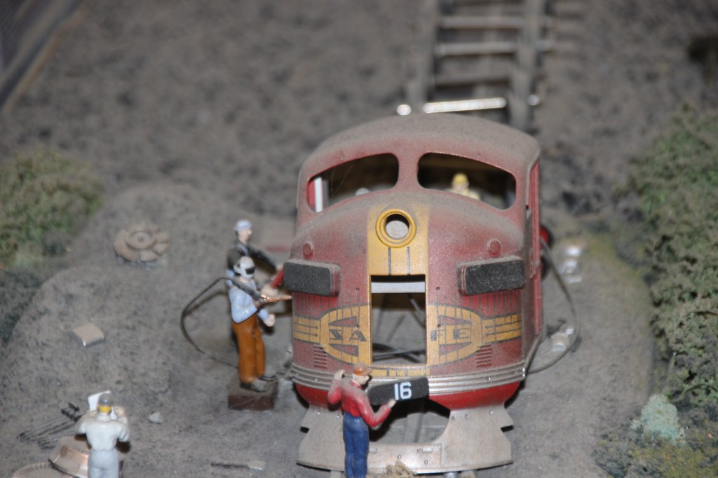 The walls were lined with every type and size of model train imaginable. The middle of the huge building had train towns set up and running. Whistles were blowing, lights were flashing and tiny people were in action.