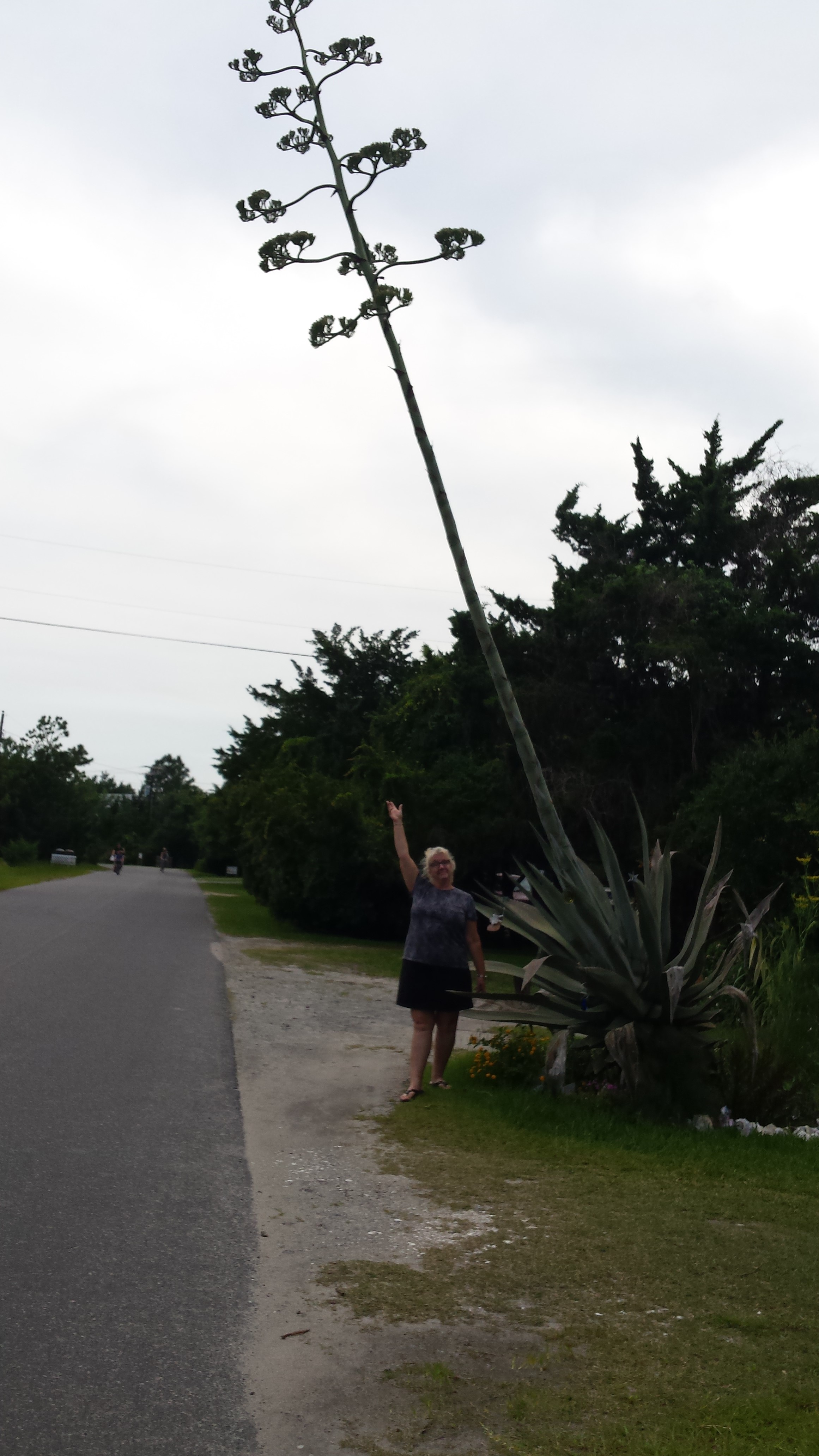 I finally got two, tiny Century plants of my own while on Ocracoke Island. That is me under the stalk of a blooming Agave americana on Ocracoke Island.