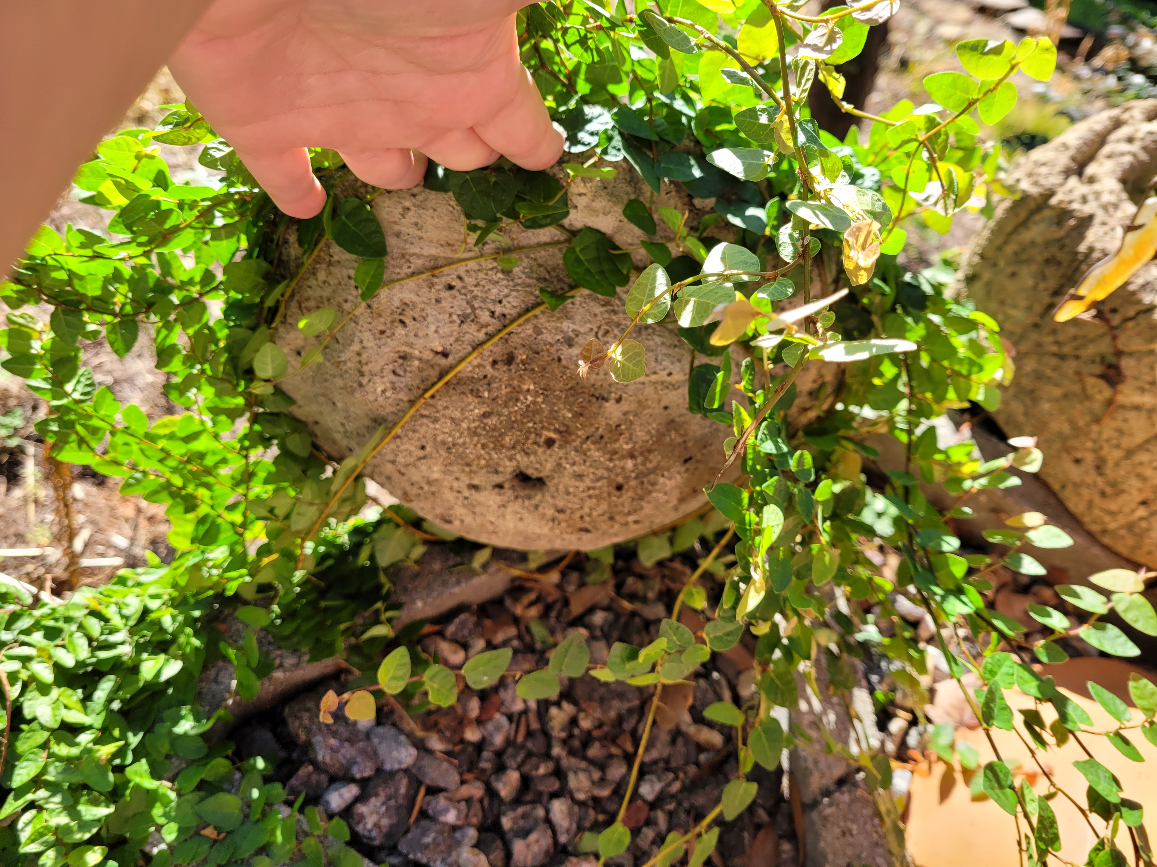 The Blue Spruce sedum cannot get what it needs to thrive because it has been covered over by an agressive plant.