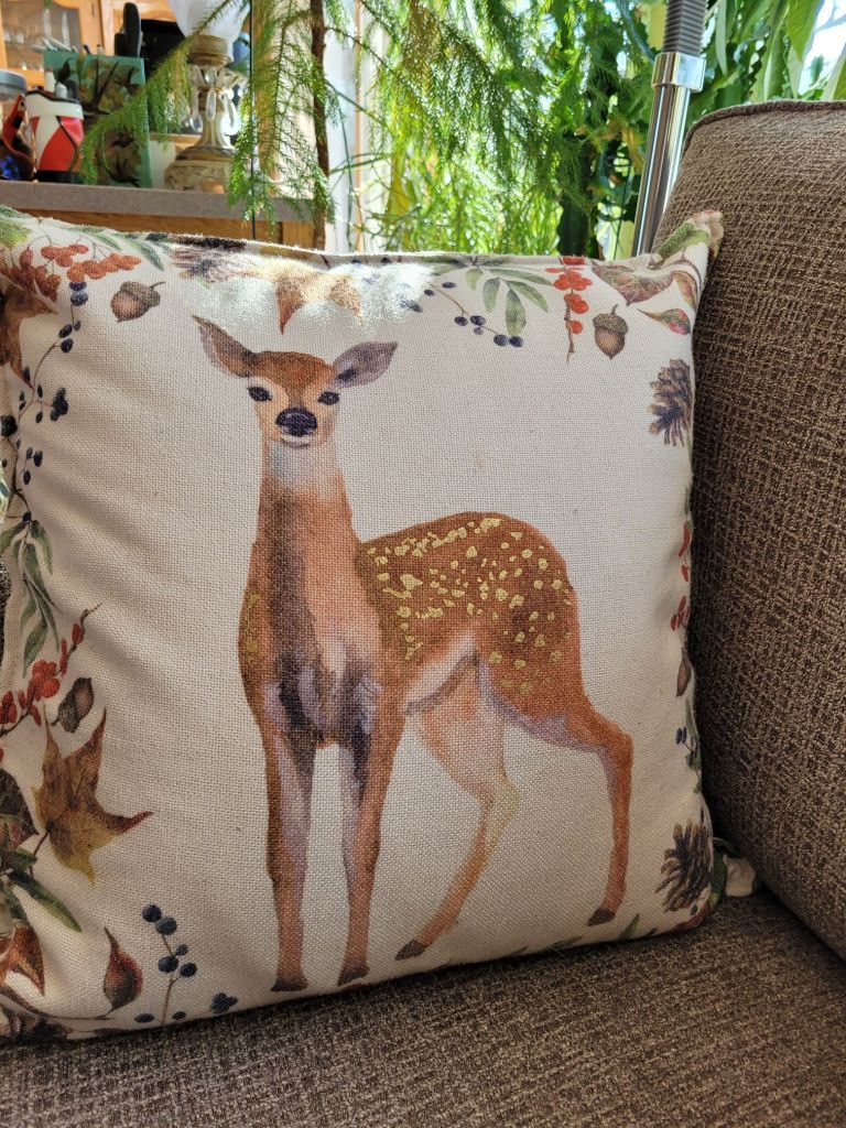 I started with the deer and its feathers. The feathers went in the trash. The deer got a new pillow.