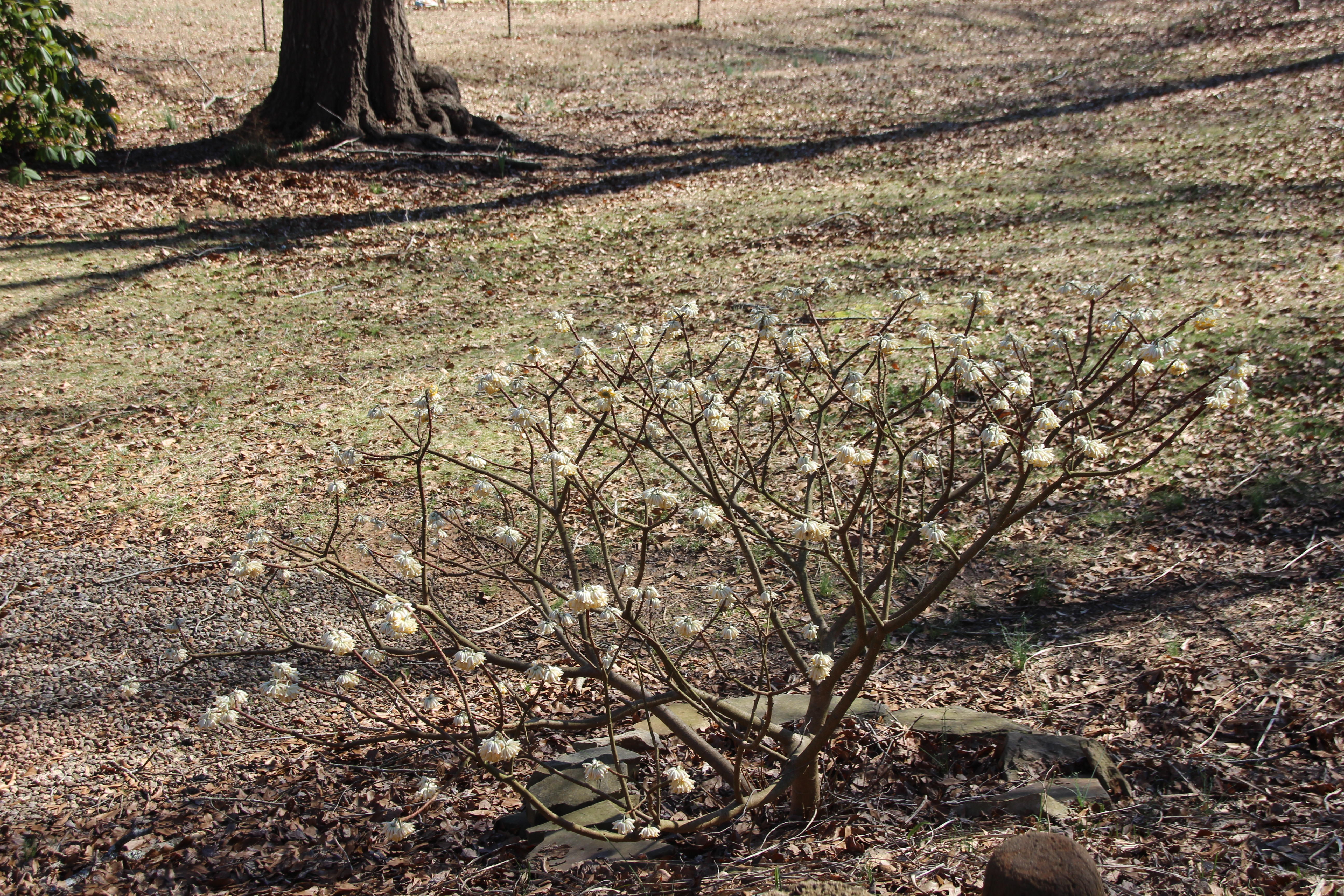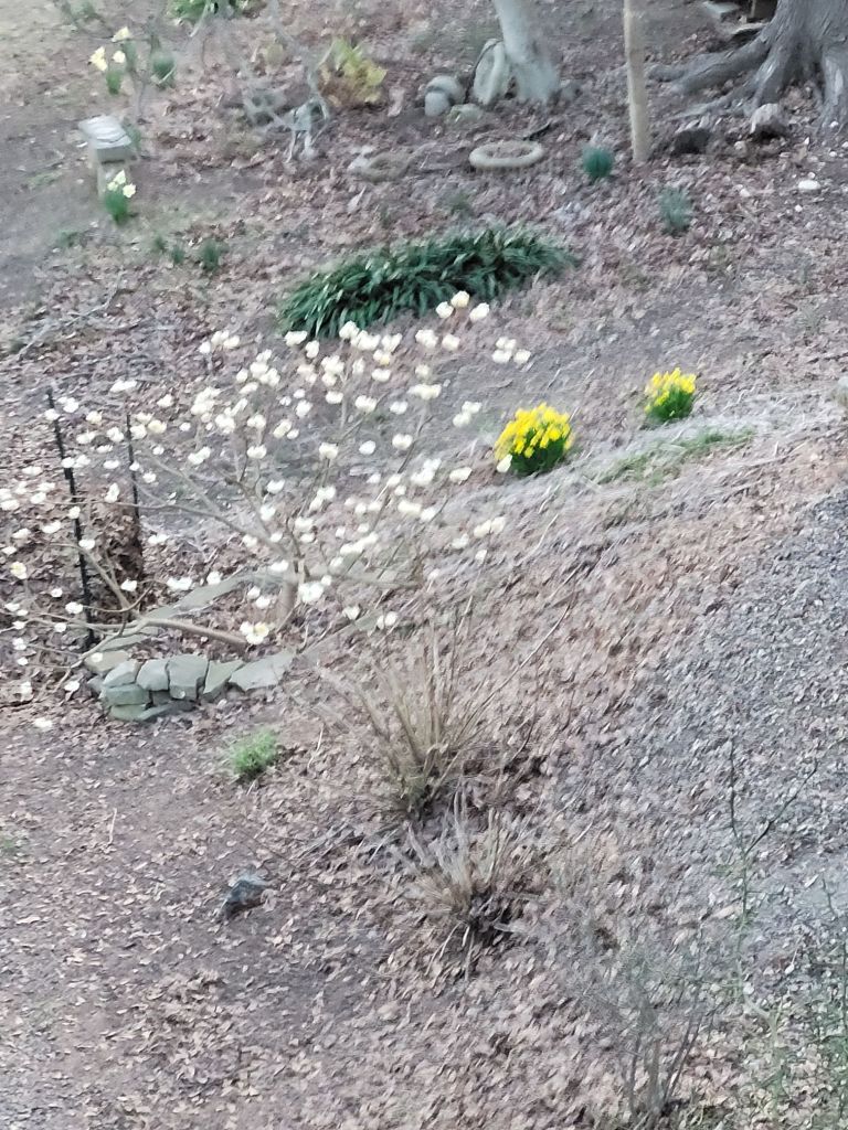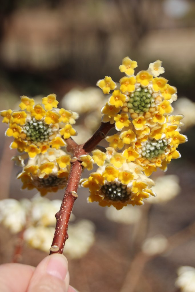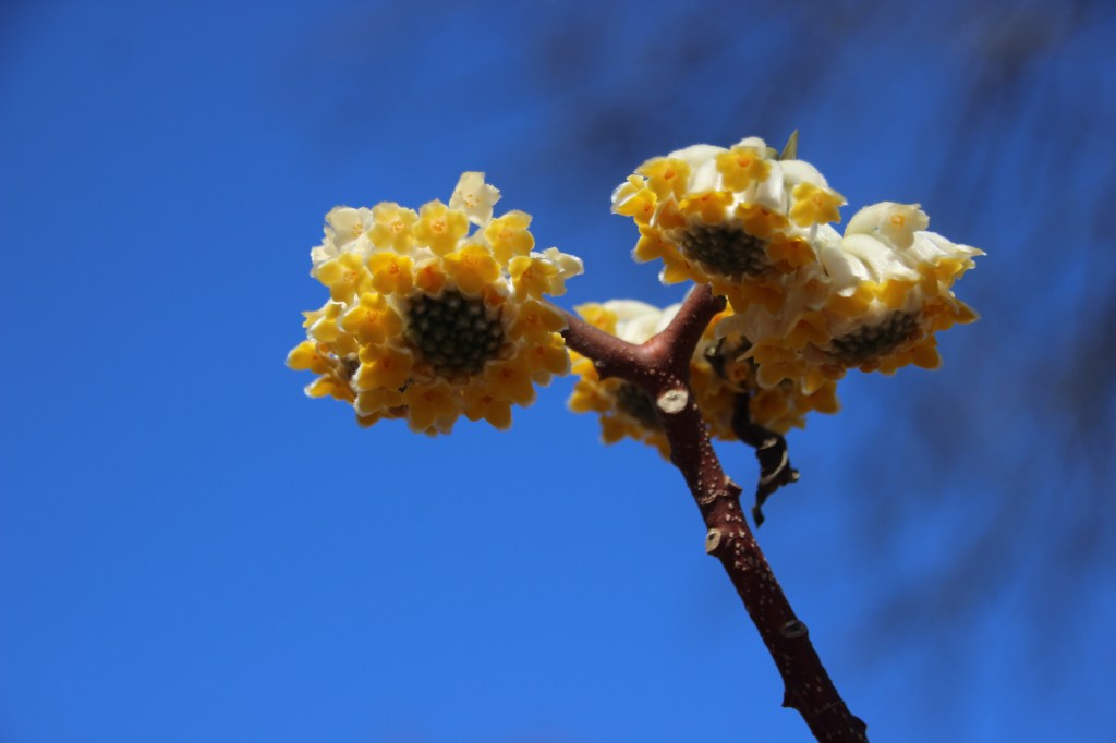 The Edgeworthia bush has perfumed the yard for weeks. Its dangling blooms are now poofy like pompoms.