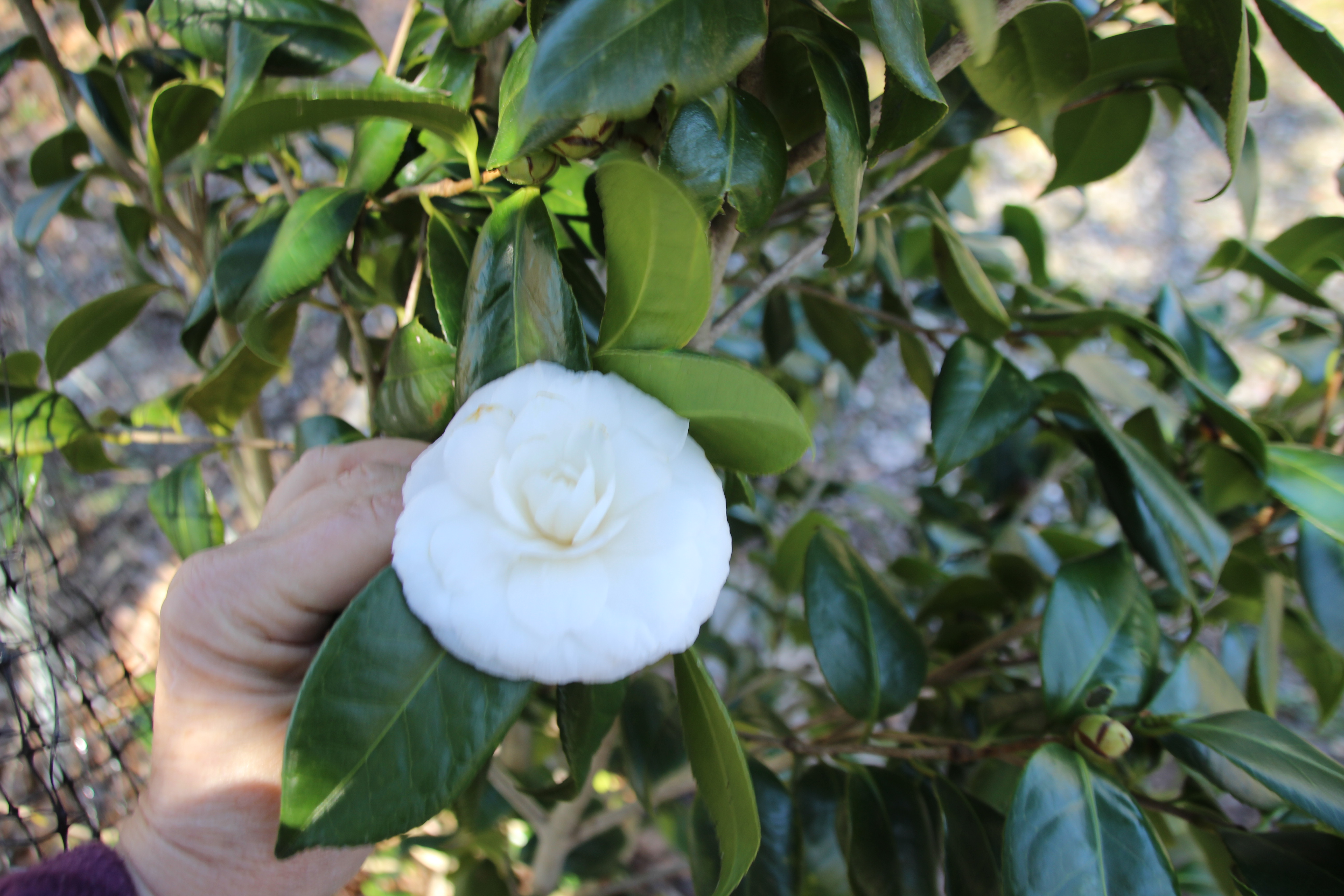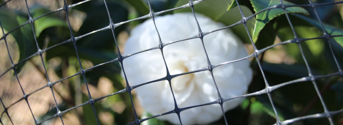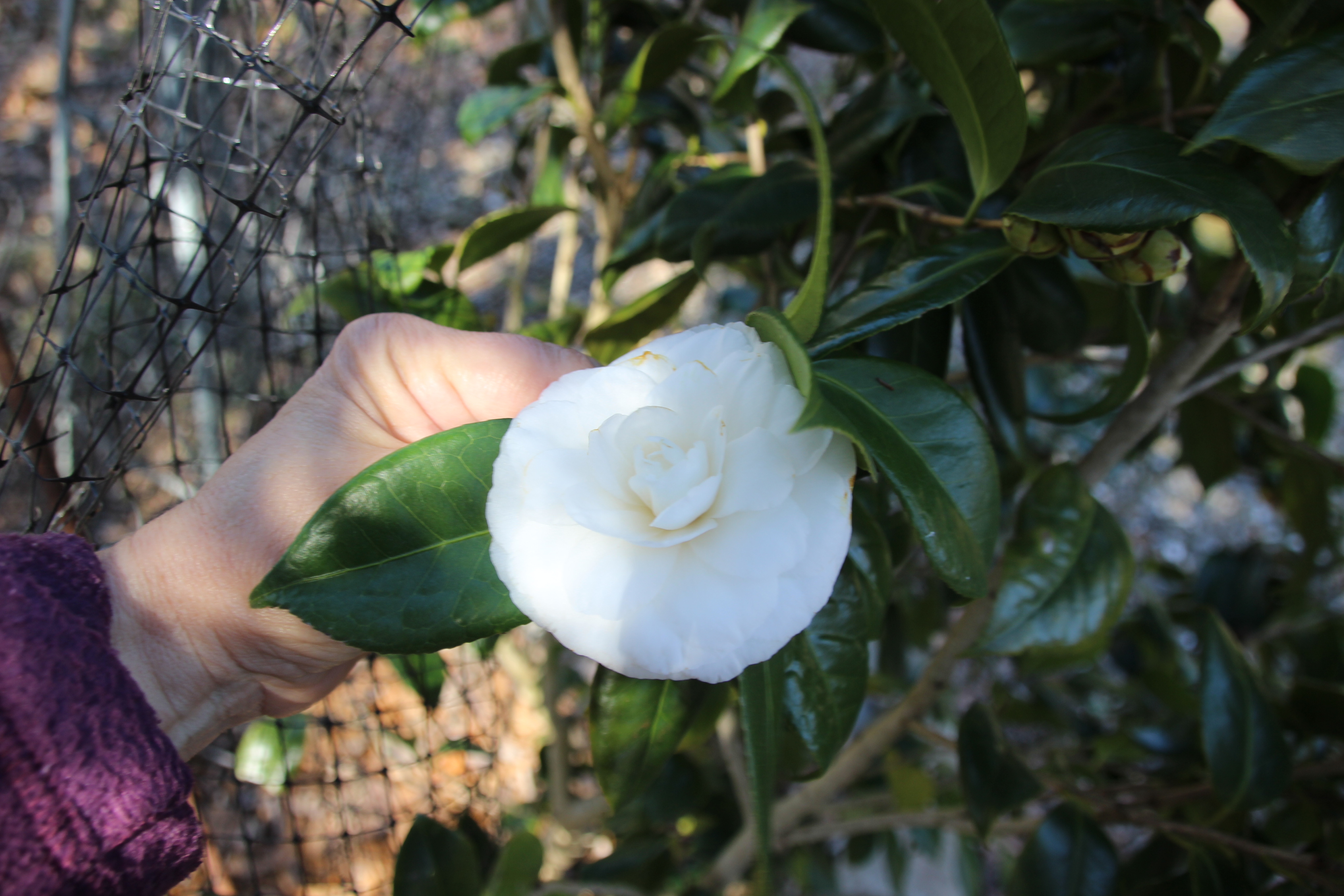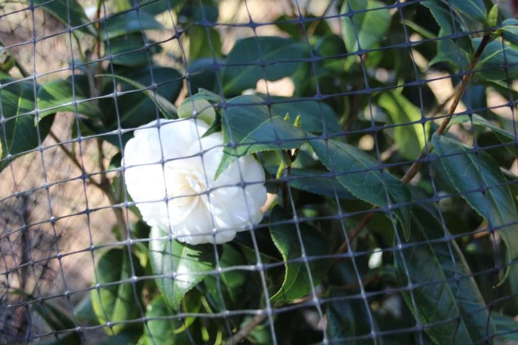 One of my Camellias, ‘White by the Gate’, has burst into bloom.