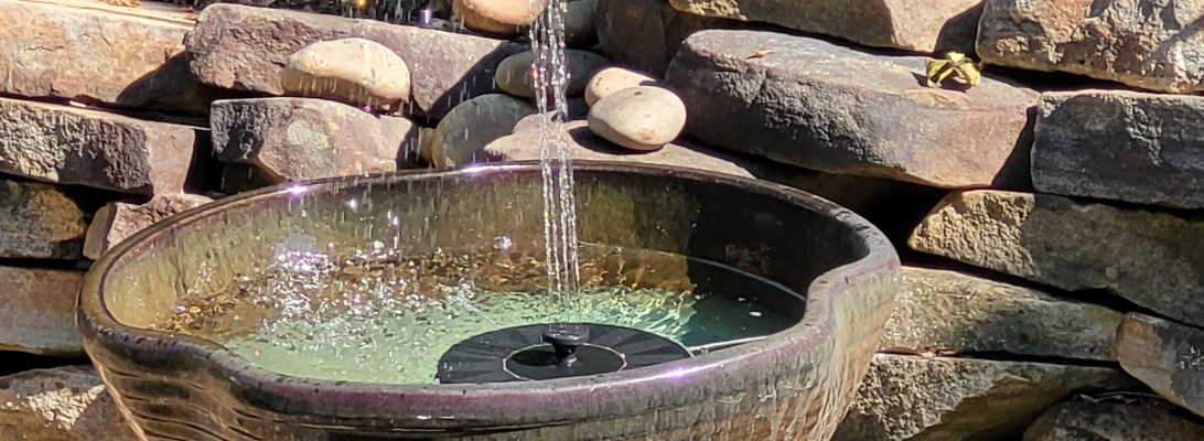 This last photo is of a solar powered fountain that my sister gave me. It is my new toy. The height of the spray depends on the brightness of the sunshine. When a cloud passes over, it spits little spurts of water. I sit in one of my chairs to watch… Old lady entertainment!