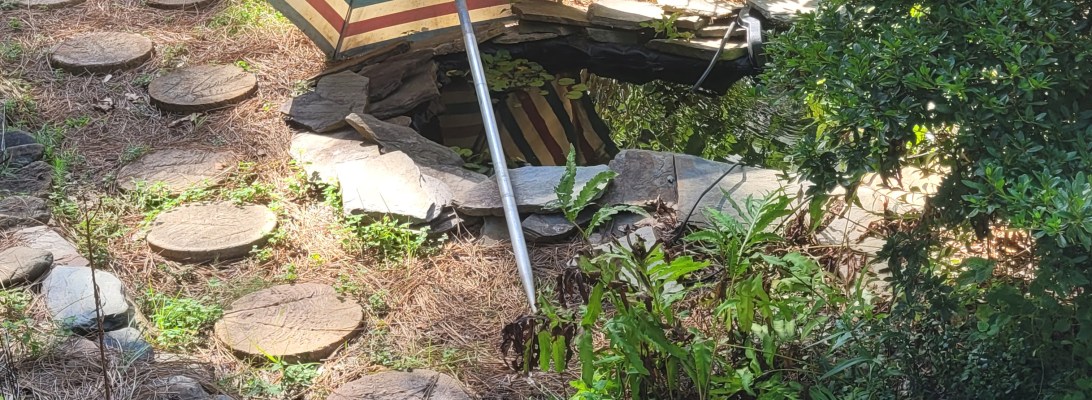 It is older than I am. There are mud dauber nests in it. There is rust. It should have been tossed while cleaning out the house on Enwood. I even placed it near the trash cans several times. Every time I moved it around I thought of sand and waves and the green Cox camper. In the end I just couldn’t let it go. It was such a loyal guardian on all those beach trips. I can still see my daddy pushing it around and around to get its point deep into the sand. So here it is now, in my garden, protecting the fish from cooking in their pond on these hot days in July. It still has a job to do. It is no longer pretty, but still sturdy and useful. It still has value. I am grateful for this umbrella and the memories it holds and the protection it gives. My daddy is still helping me in so many ways.