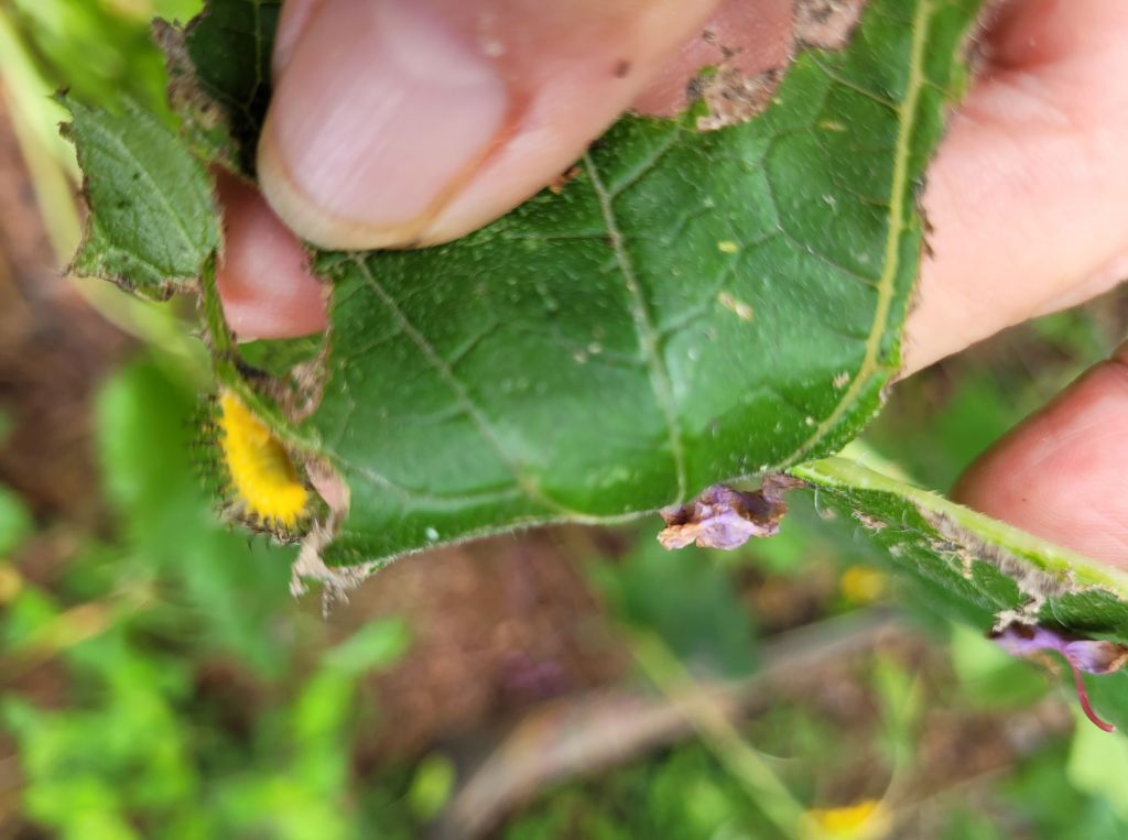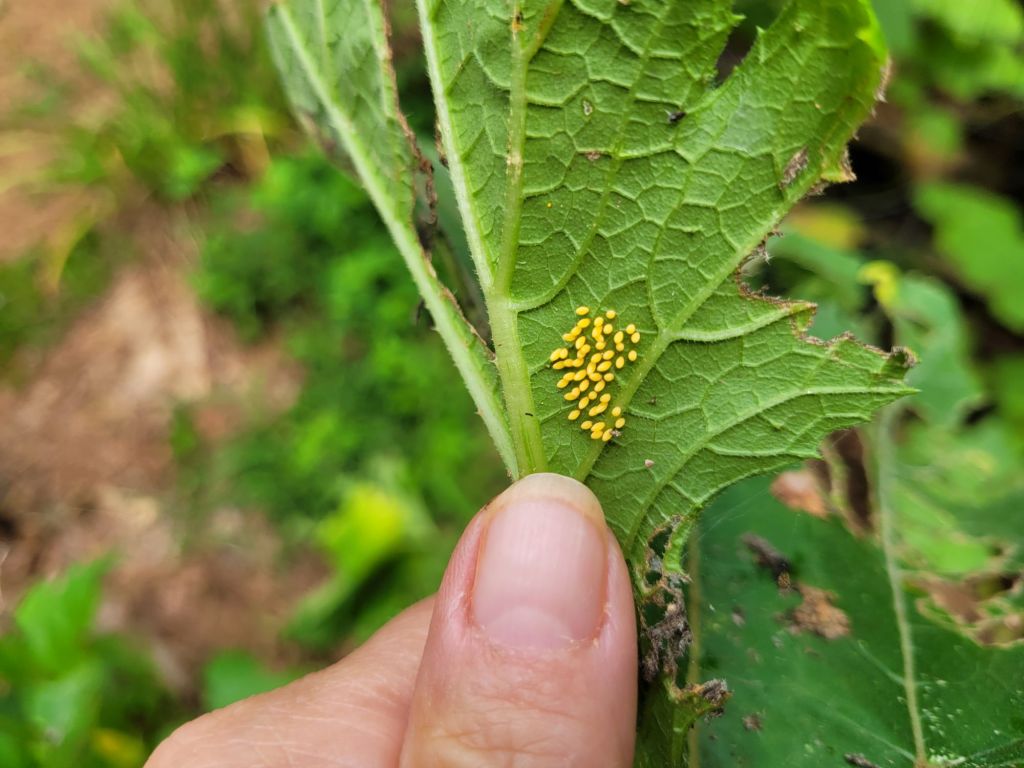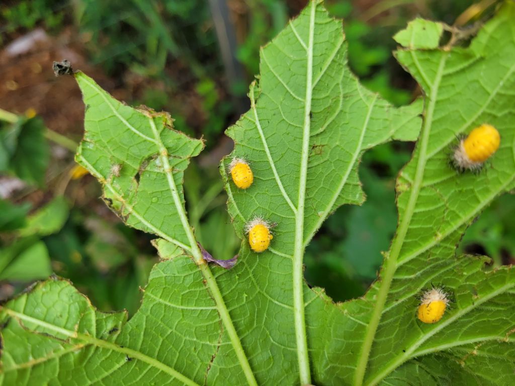 This was not the usual culprit. Instead of finding the golden eggs of the squash bugs, I found a cluster of yellow eggs. I hoped these were ladybug eggs, so I left them.