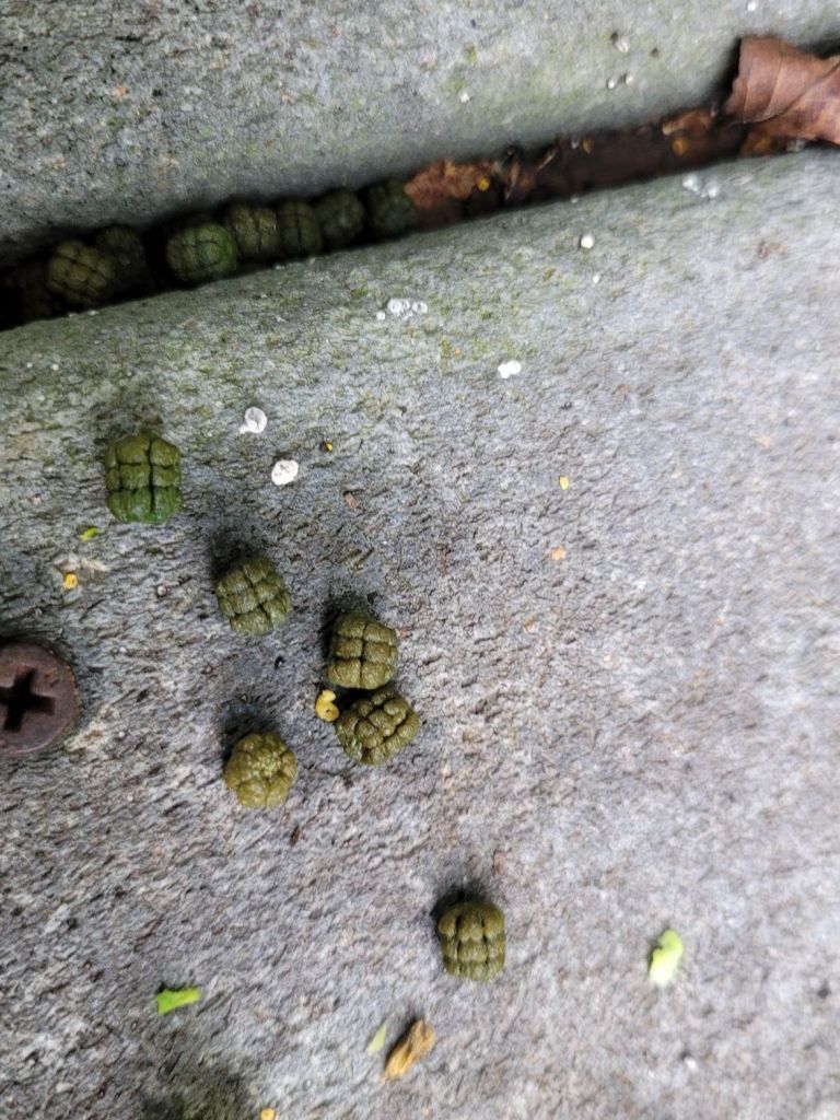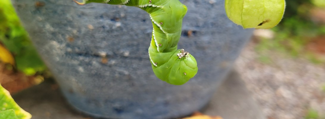 The hornworm leaves his grenade-like frass under the plant, so I know where he is.