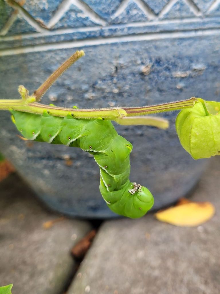 I spied someone else snacking on the ground cherry this morning. A Tobacco Hornworm is devouring the delicate ends of the ground cherry limbs.