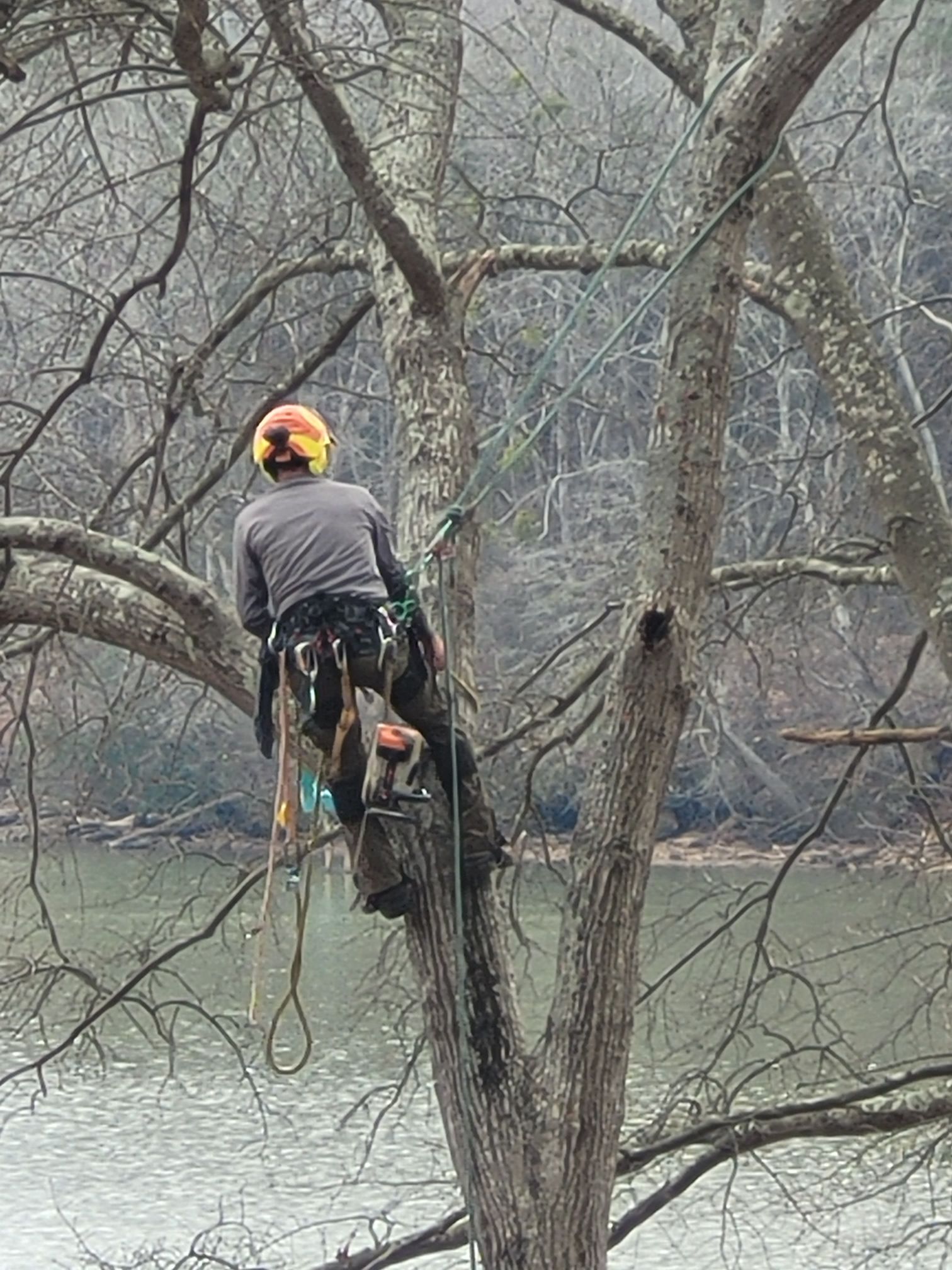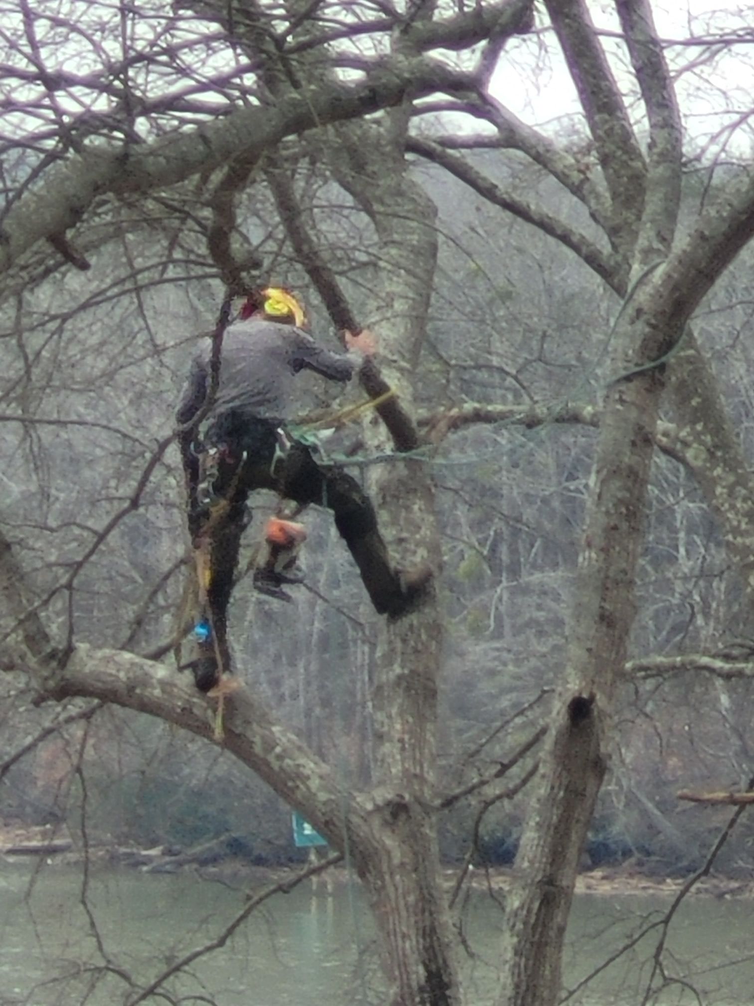 This experienced crew provided several hours of entertainment today. The climber is sixty-one years old and is a third-generation climber. His brother also climbs and was doing a different job today right across the river.