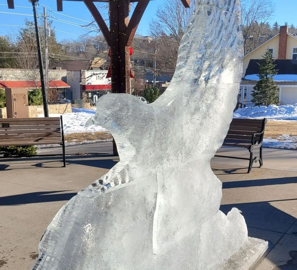 I missed Winterfest here because of a snowstorm. By the time the ice on my road had melted enough for me to get downtown, only the giant demo ice sculpture in the park’s gazebo was left. I saw it shining in the sun as I got out of my car.