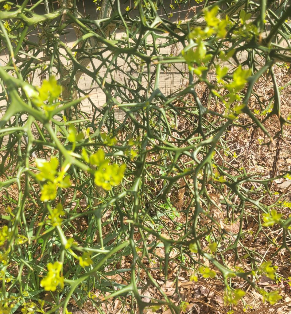 The long limbs must be chopped up to burn if not carefully placed out of the way to be used as a fence. The thorns can penetrate a tire. Its nickname is Flying Dragon. I should have been discouraged by this name, but I am a fool.