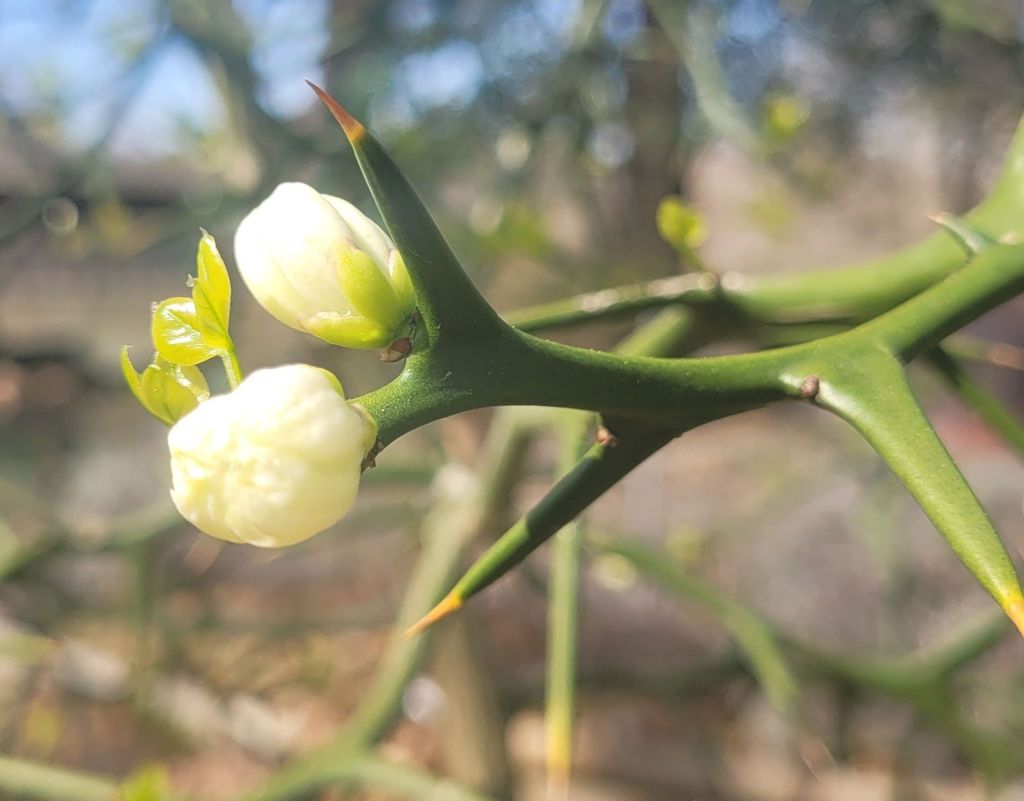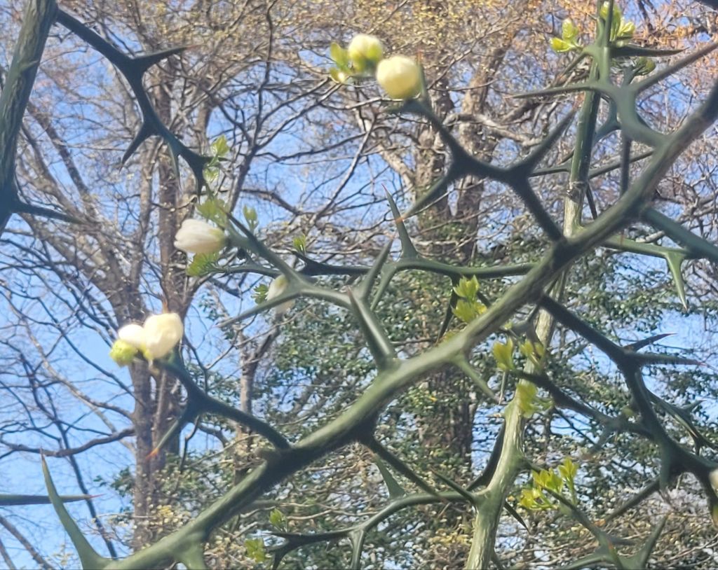 There is one new development with the Poncirius. It is blooming for the first time. This makes things complicated. You see the fruit might fall or be carried off and the seeds may germinate. This pointy plant can become a pest in the south. I am surprised at my biologist self for bringing it home. I intended to keep them in pots, but they got too big and mean to bring in.