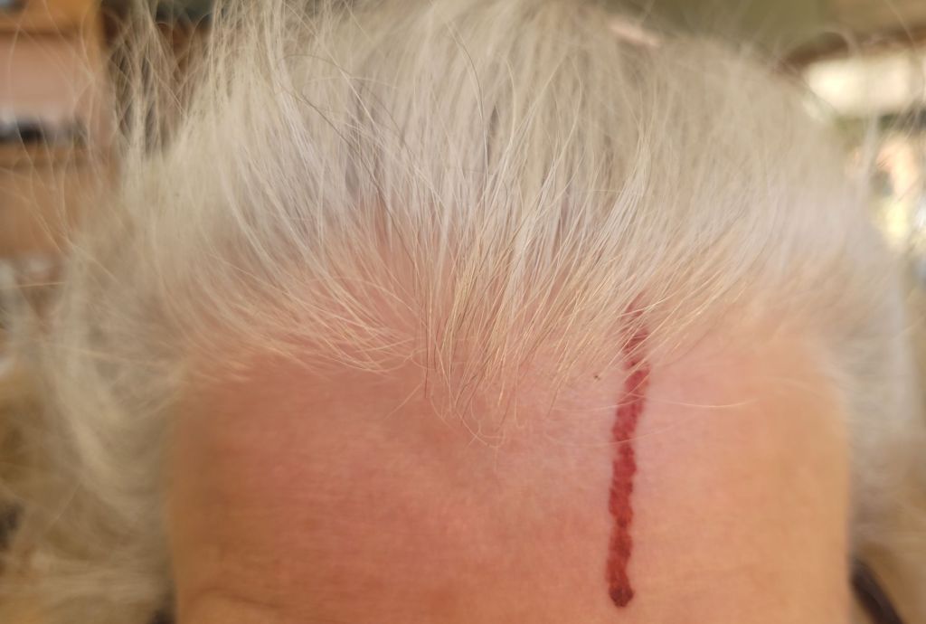 No one realized I was injured until I turned around to speak to my husband and neighbor. They both gasped. A picture was taken. Then Mr. Flower decided to take over the clippers for the next shrub, which is on a bank.