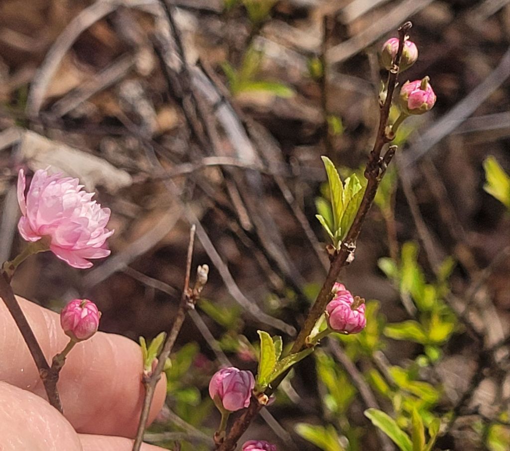 This tiny flowering almond bush came from my parent’s home on Enwood. I am so glad I took some before we sold it.