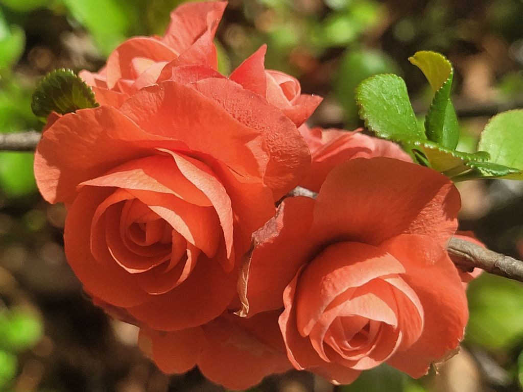 This quince, Chaenomeles ‘Double Take Orange Storm’ is in a fence because the deer would demolish it.