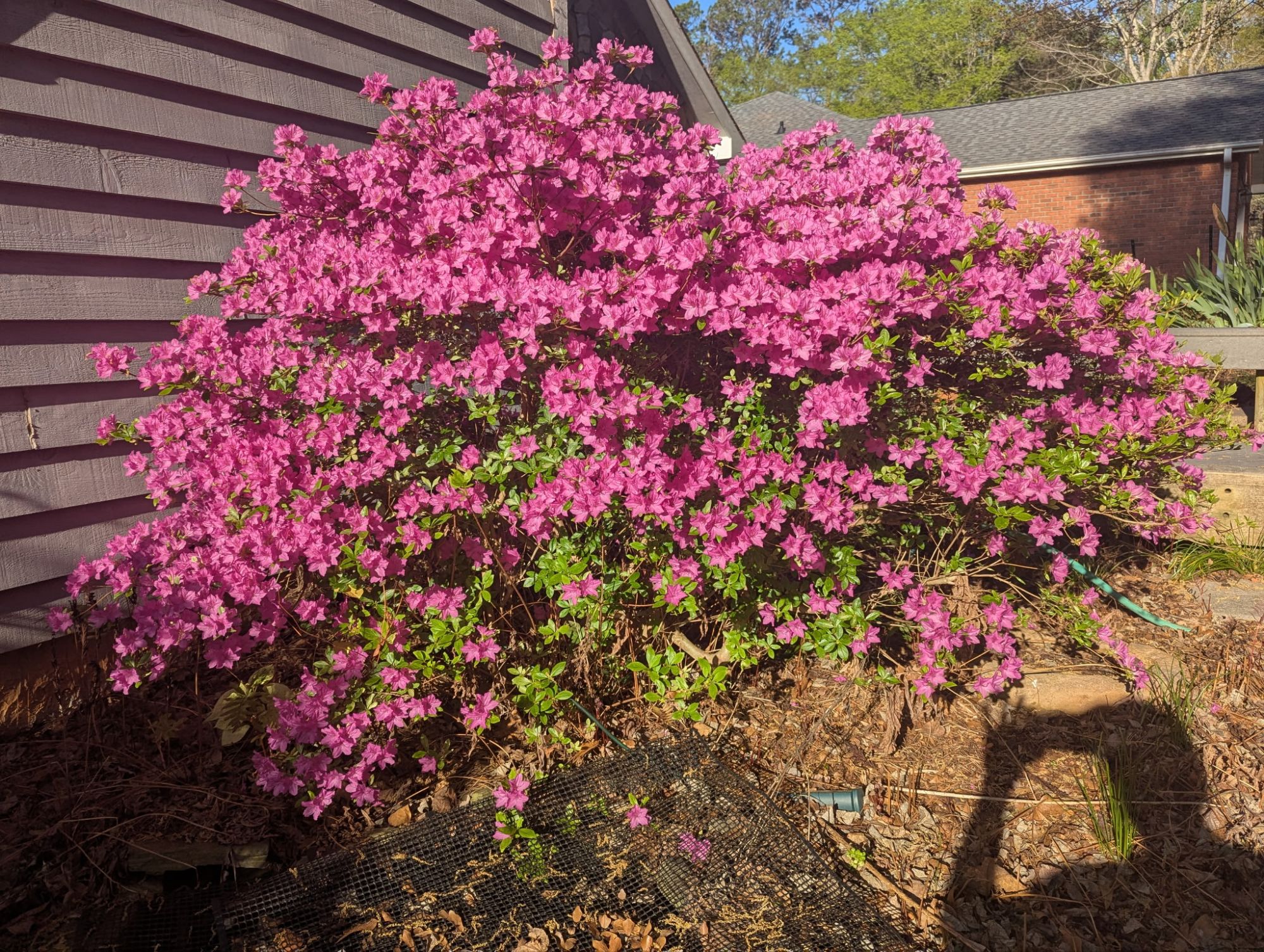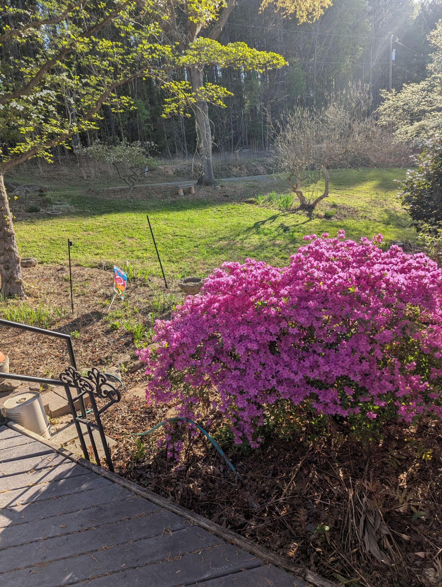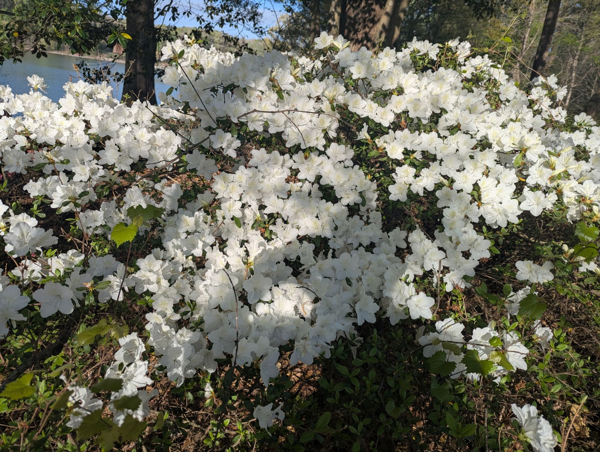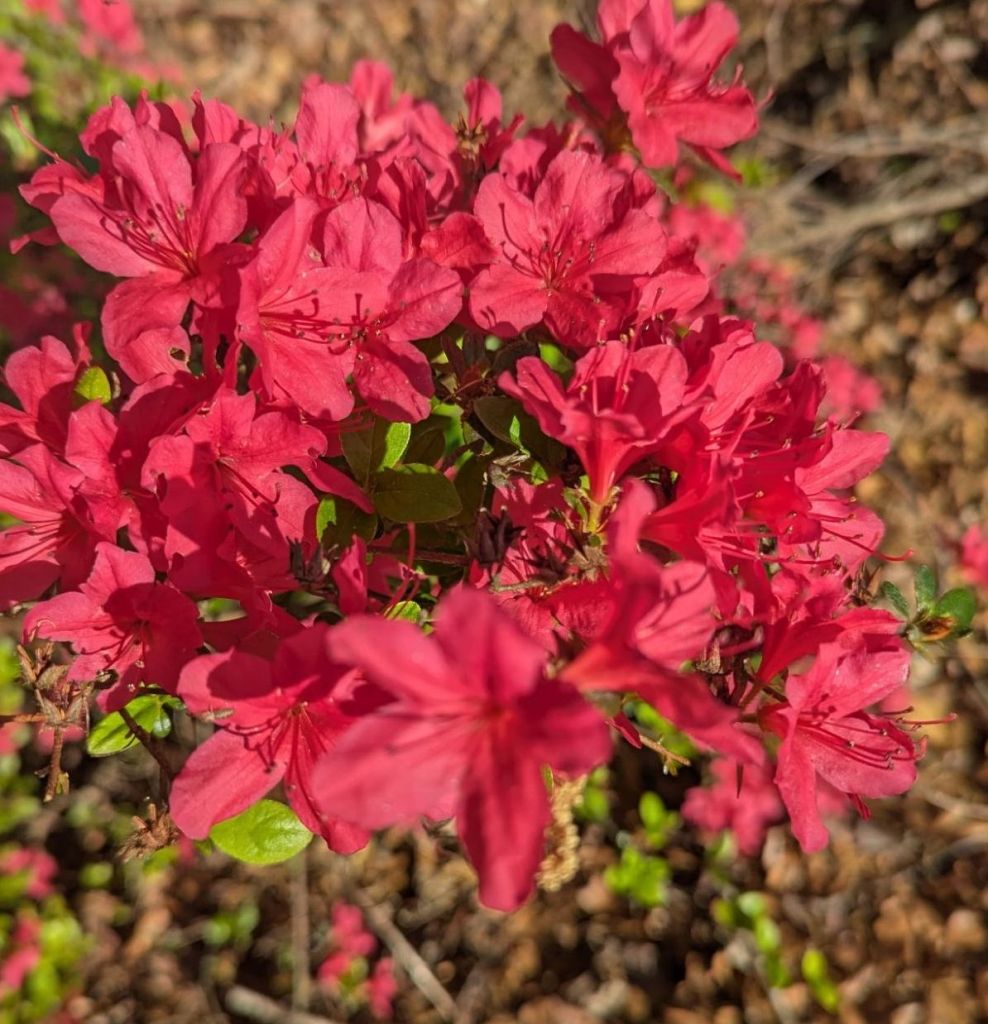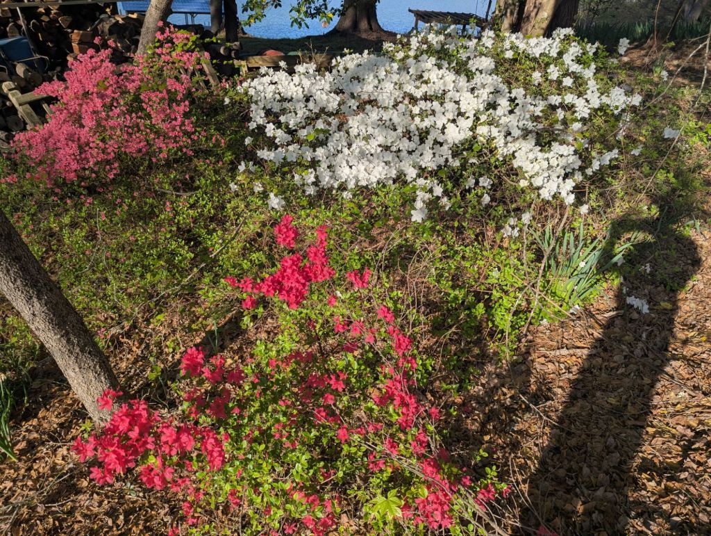Here he is photographing our thirty-six-year-old azaleas. I was young then. I could not decide on a color, so I bought one of each. My first horticultural experiment at the lake.