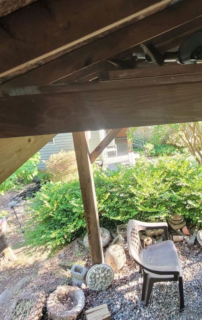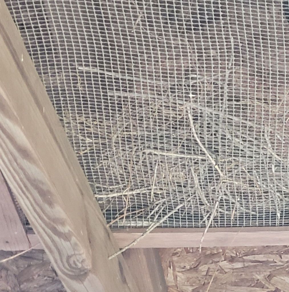 I was sitting in the carport lamenting my loss, when I spied a pile of sticks on a frame with hardware cloth attached to it in the front corner of the carport. It is a bit too close to Mr. Flower’s precious truck.