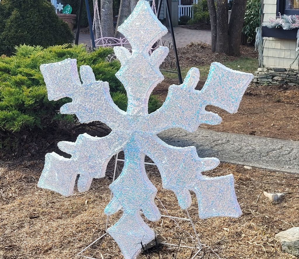 The tree in the middle of the yard held colorful lighted ornaments. There were several angels. The gold one had flapping wings. The lighted mailbox’s door opened and closed. There were cute teddybears here and there.