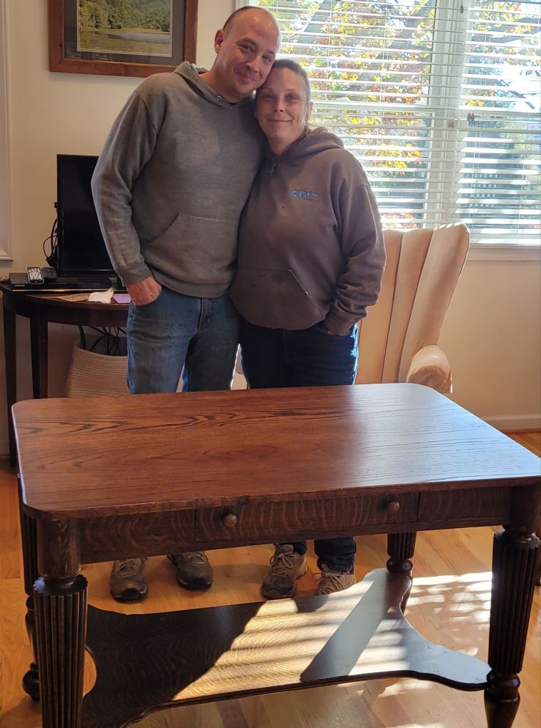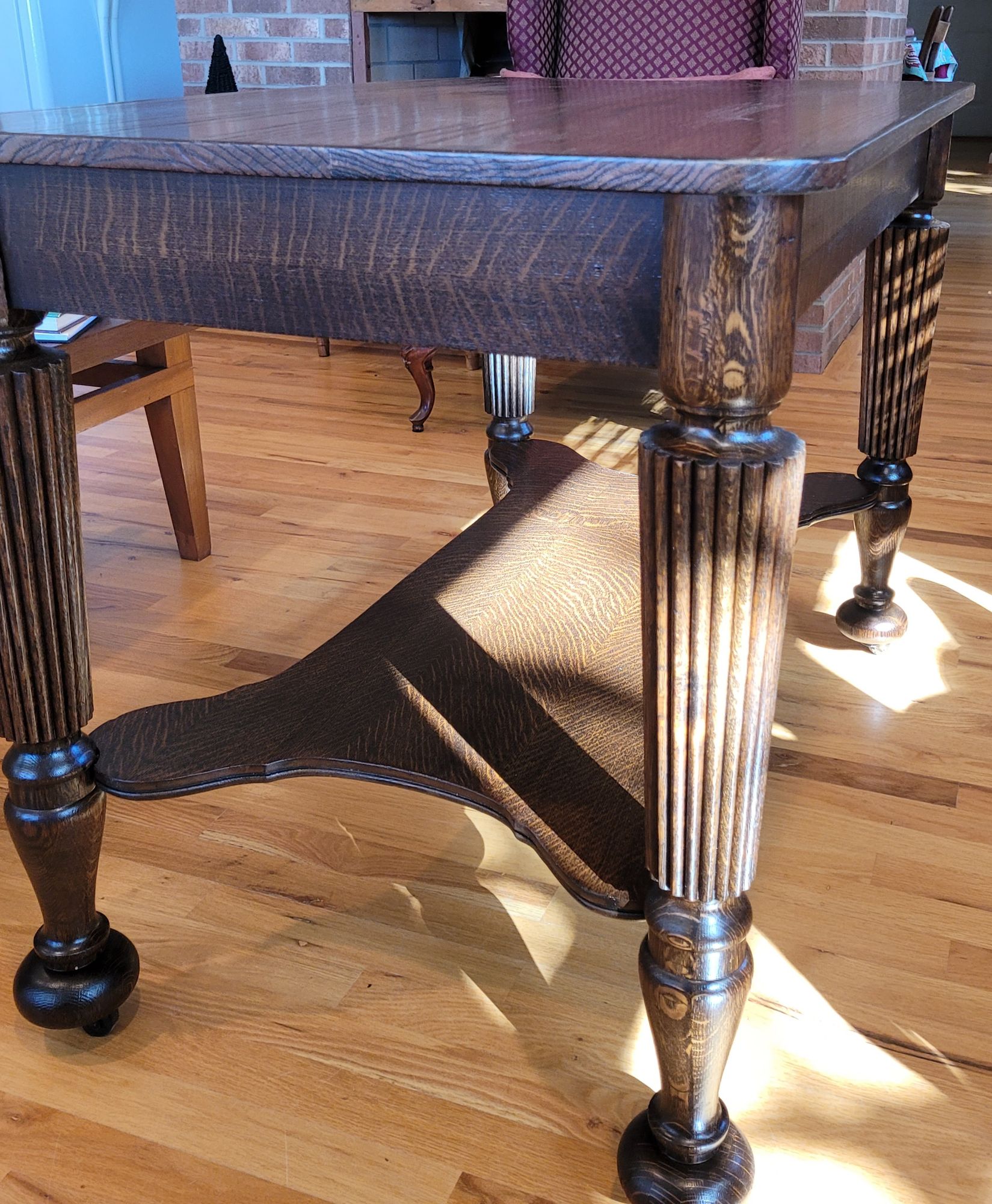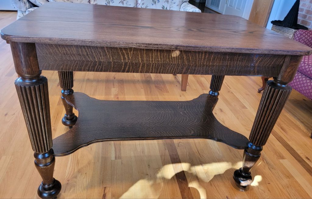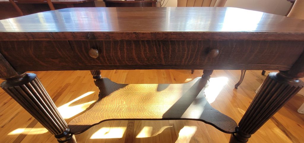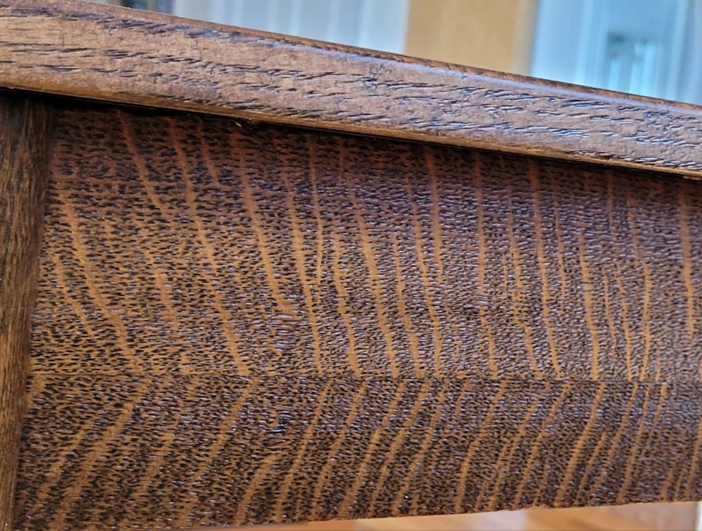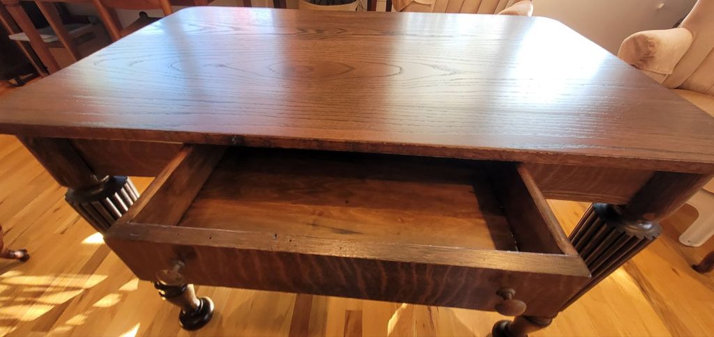 The Zebra top veneer was replaced by solid oak. That old veneer was missing a corner, crackly and warped. Now, the top is solid and ready to be used.