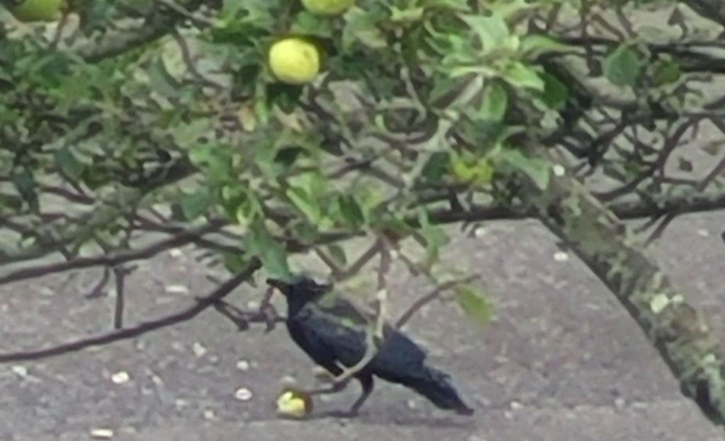 One crow actually throws them down on the asphalt so the apples break into pieces. These pieces are snatched up by some noisy smaller crows which I suppose are her offspring.