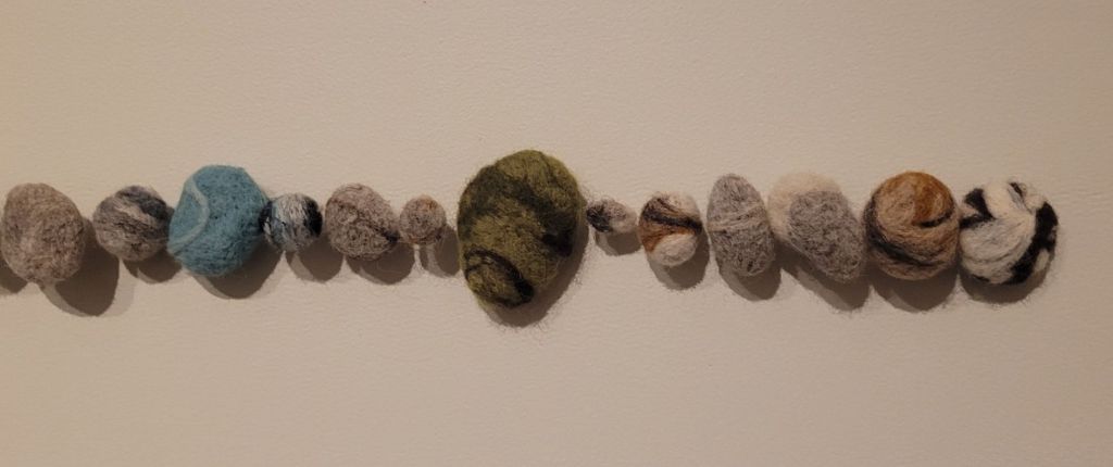 In addition to the pile on the floor there was a long line of rocks made of wool. The artist made one every day during the Covid Lockdown. Some were lovely while others were little angry wads. I understood those.