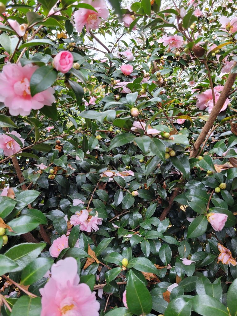 I have not been able to walk steadily since April. I did not stray far from the house for fear of falling until three weeks ago. During these months of my absence, the Camellia grew. Twigs and leaves grew right through the plastic mesh protection. The new growth became tangled and deformed from being enclosed for its safety.