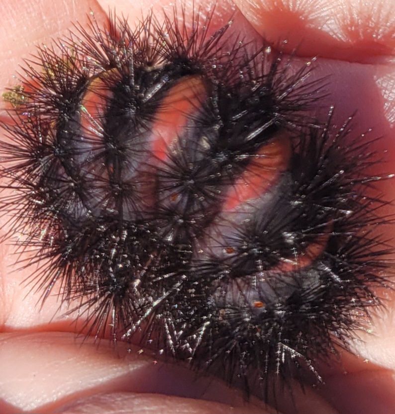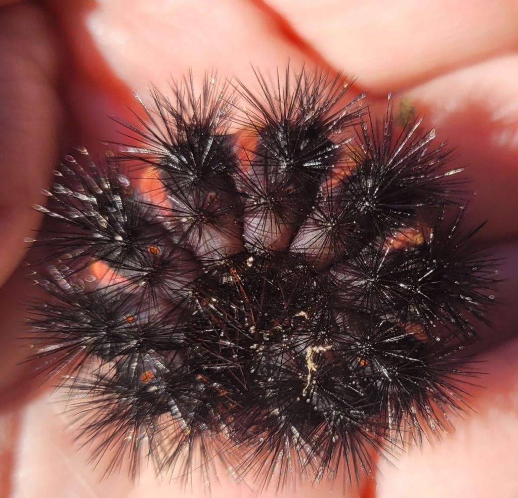 The shiny black setae/hairs are arranged in star-like tufts that do NOT sting. The tufts deter predators which usually do not like fuzz in their mouths and throats.