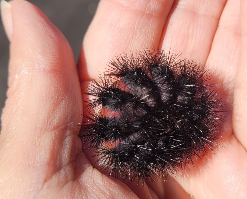 This Giant Wooly Bear is the caterpillar stage of the Giant Leopard Moth. The species name is Hypercompe scribonia. I had to use the internet to look this up. I found all kinds of misinformation and even how to keep them as pets. All this gave me a headache.