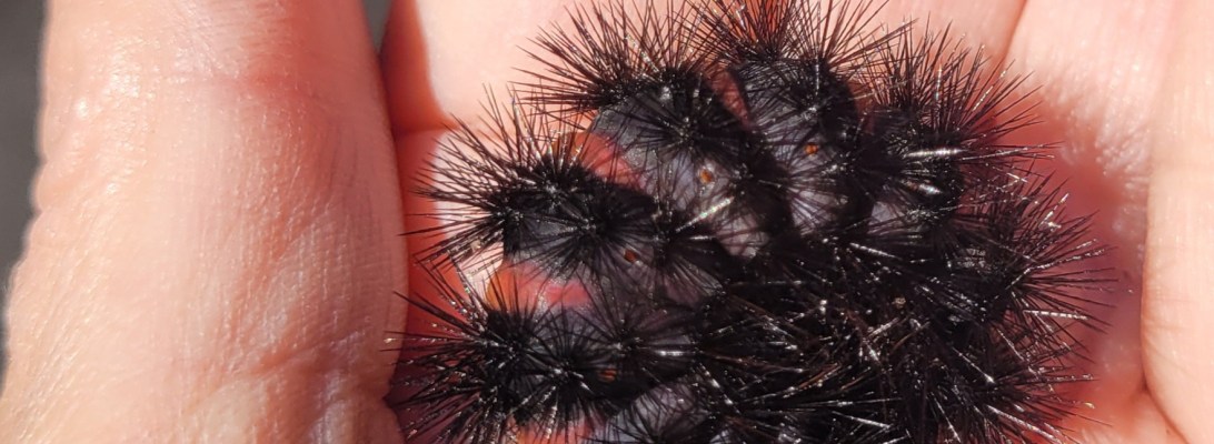 This Giant Wooly Bear is the caterpillar stage of the Giant Leopard Moth. The species name is Hypercompe scribonia. I had to use the internet to look this up. I found all kinds of misinformation and even how to keep them as pets. All this gave me a headache.