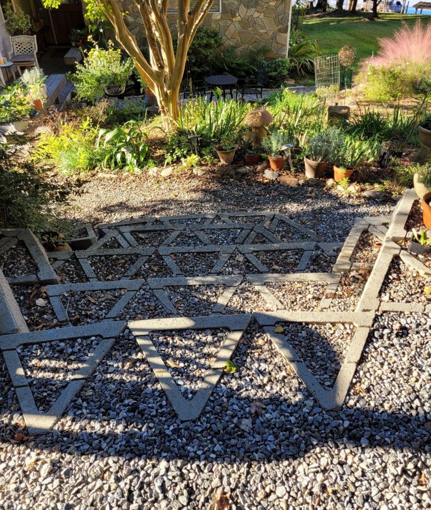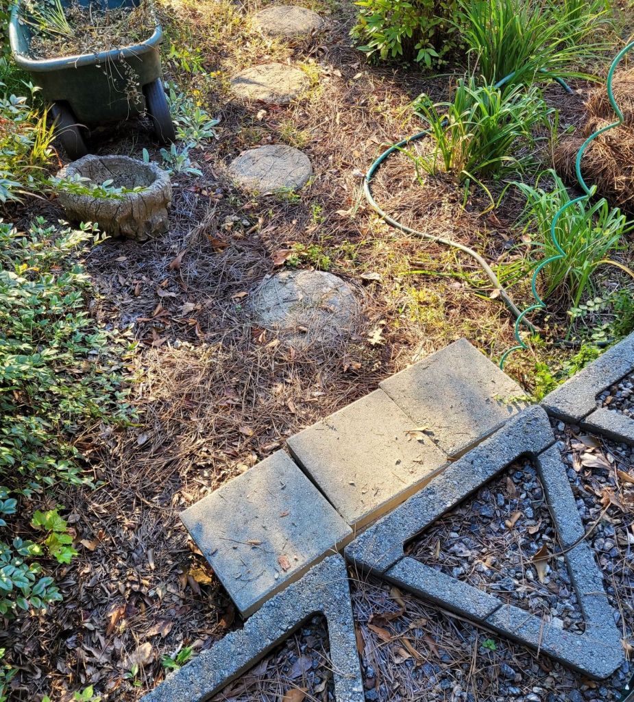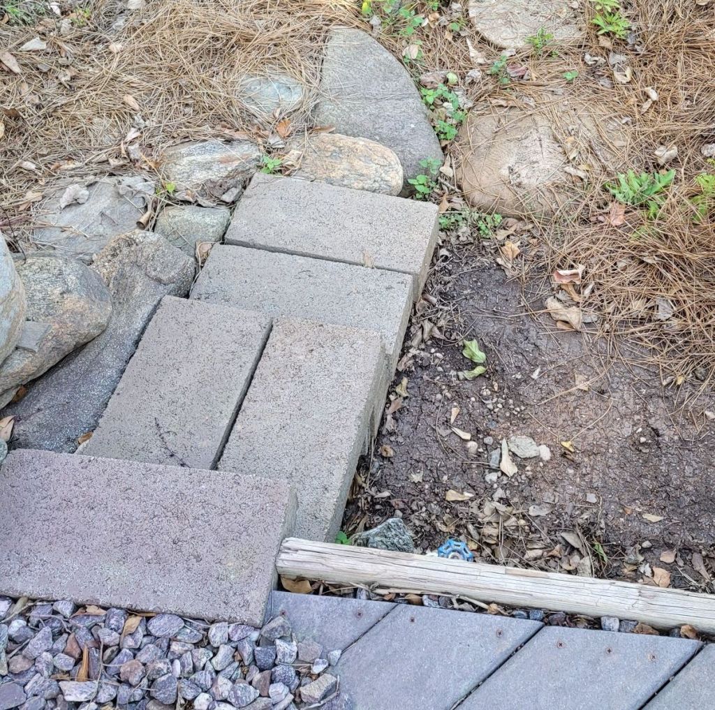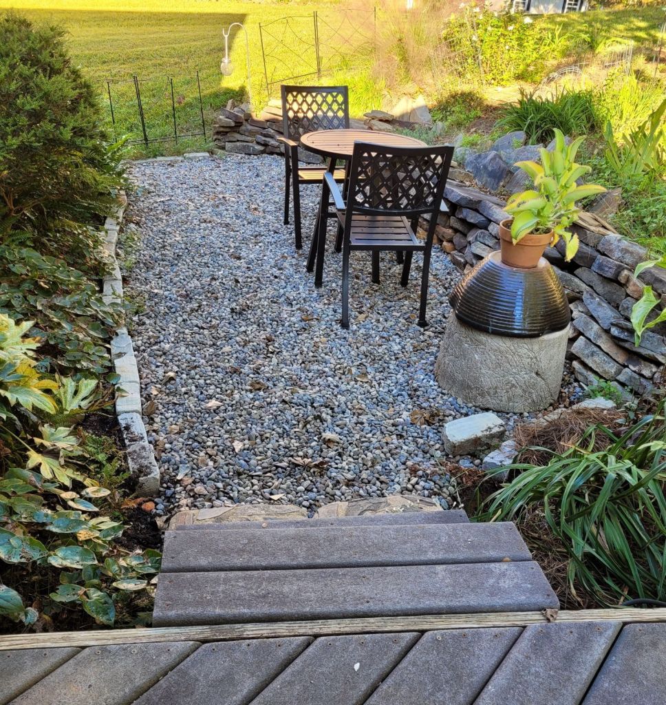 This set of steps goes to the new pebble patio. These were impossible for me to use all summer long. I am really happy to be able to escape off the deck safely.