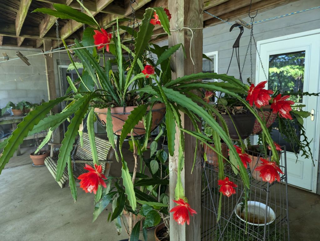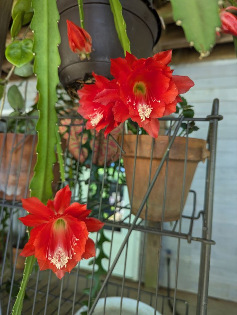 I told this new friend, Alice, that I would bring her two of my favorite potted plants to add to her collection. The two plants were Queen of the Night/ Night- blooming Cereus/Epipyhllum oxypetalum with the angelic white blooms and Epiphyllum orchid cactus ‘Over the Top” which blooms pink.
