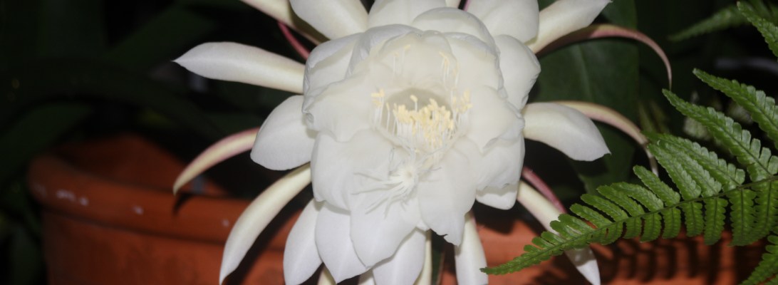 I told this new friend, Alice, that I would bring her two of my favorite potted plants to add to her collection. The two plants were Queen of the Night/ Night- blooming Cereus/Epipyhllum oxypetalum with the angelic white blooms and Epiphyllum orchid cactus ‘Over the Top” which blooms pink.