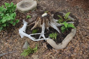 I dragged a heavy cedar stump from the woods. My grown son had to get it in place. Then I wandered through the surrounding woods looking for ferns, rocks and interesting objects. I also found some driftwood along the shore of the river/lake. The hunt was as much fun as the creation. Win, Win!
