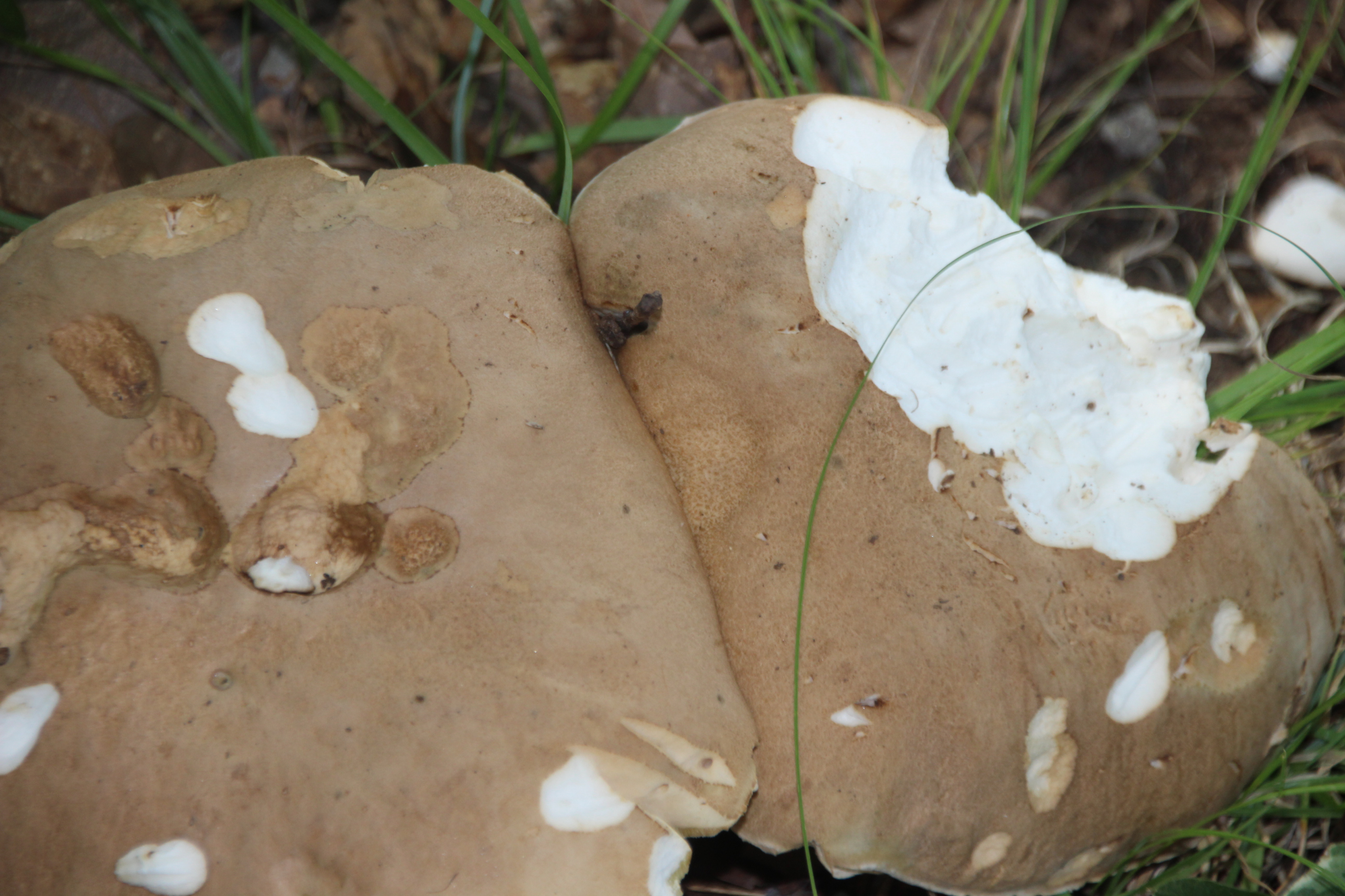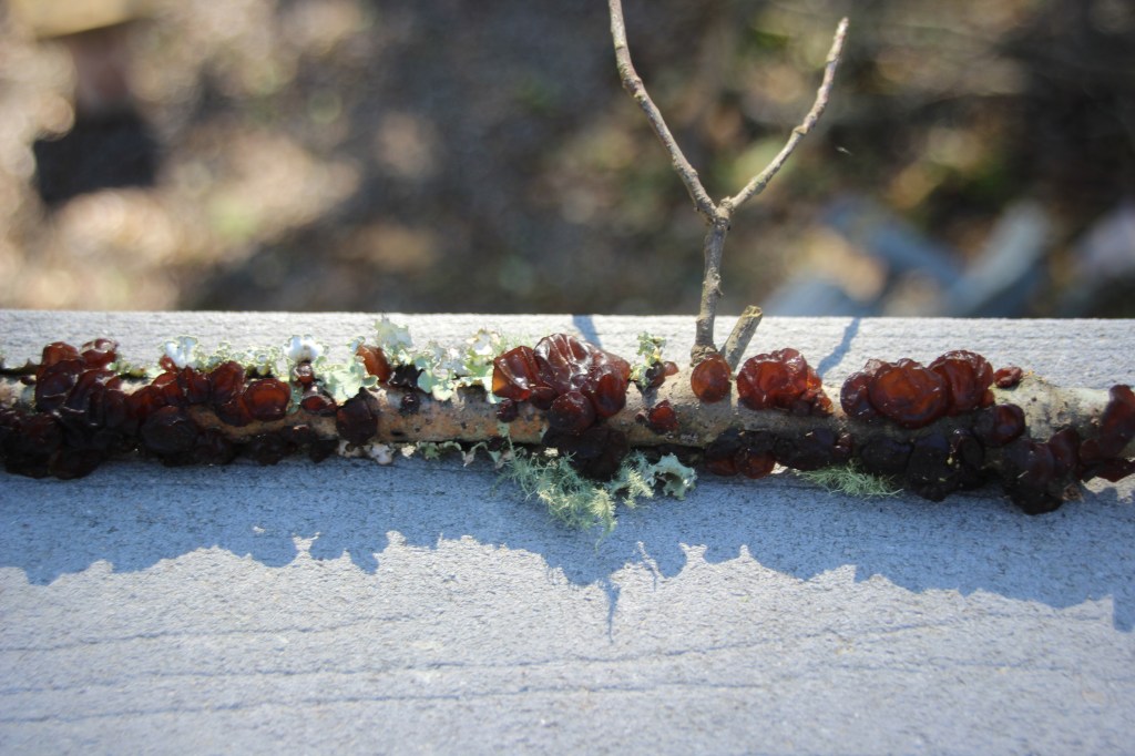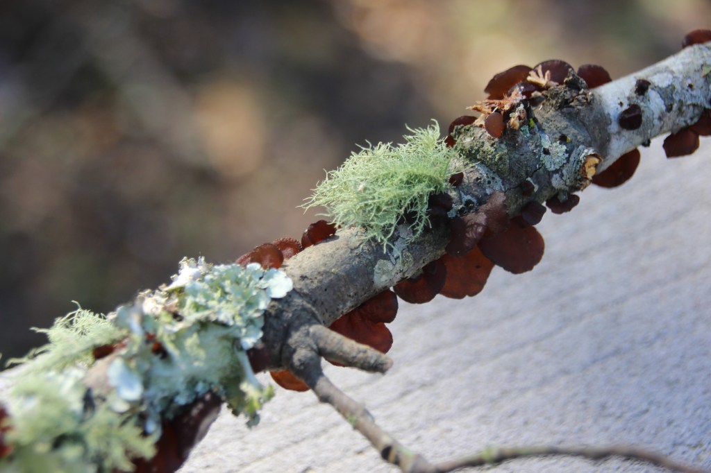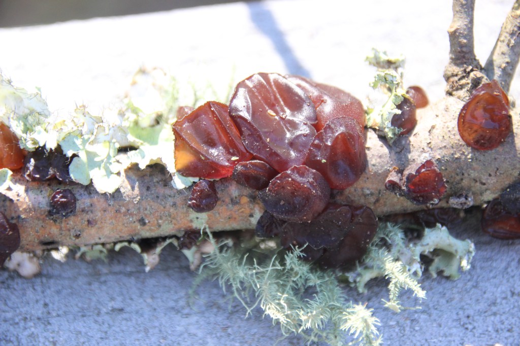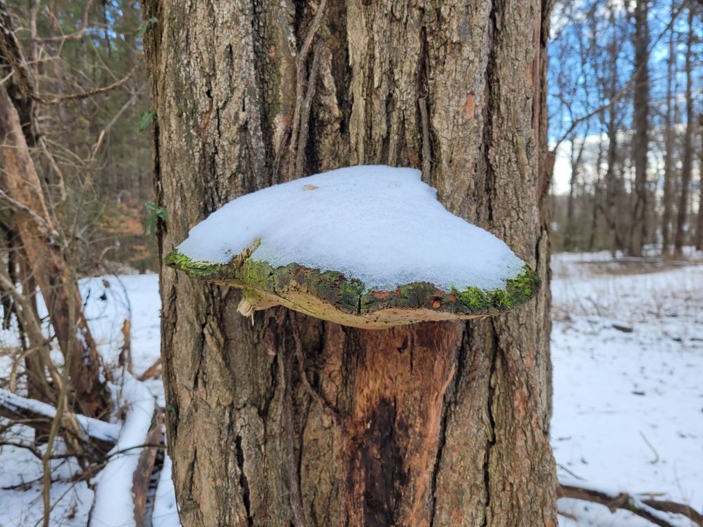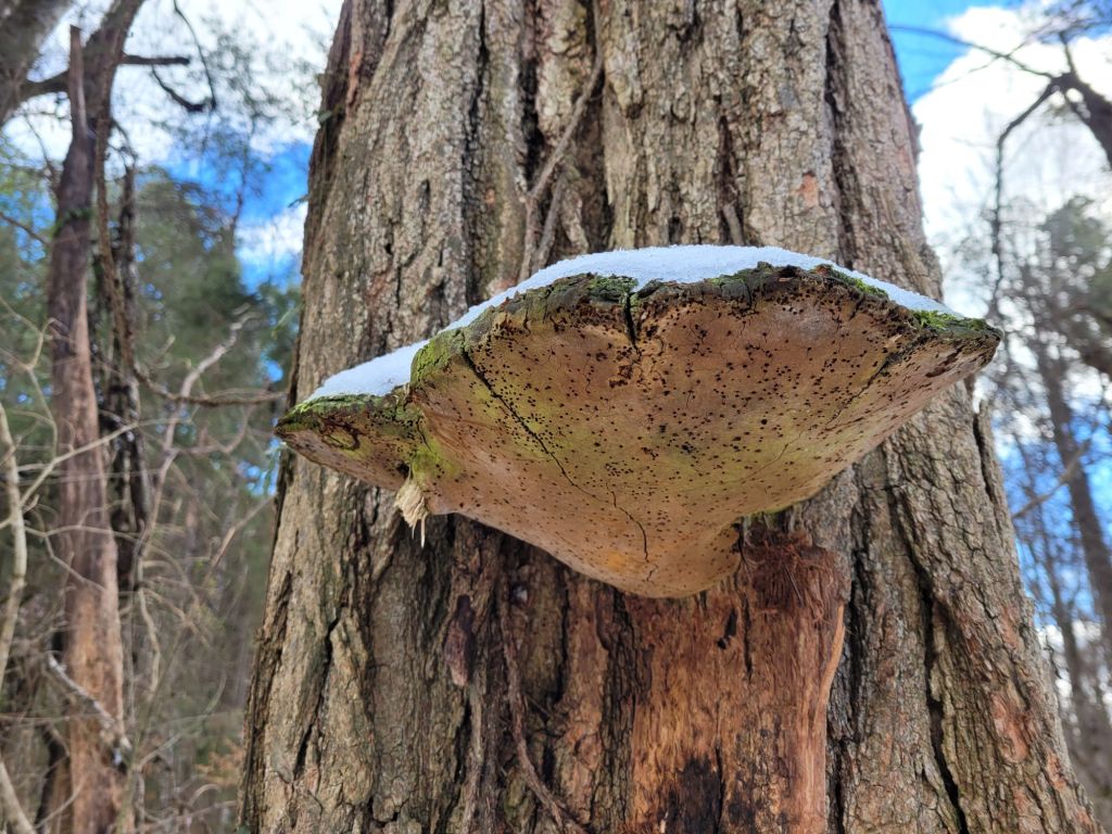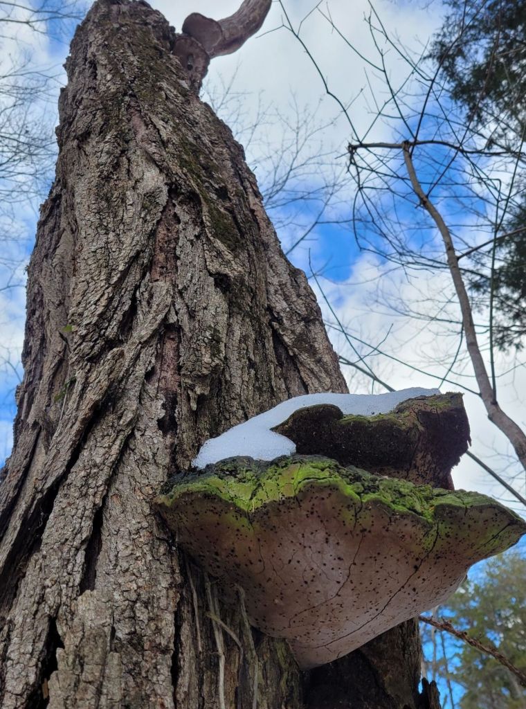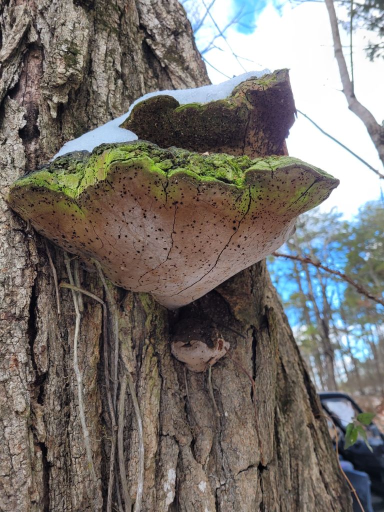 Next, a species of bracket fungi colonized in a crevasse at its base several years ago and have continually replaced several generations of fruiting bodies.