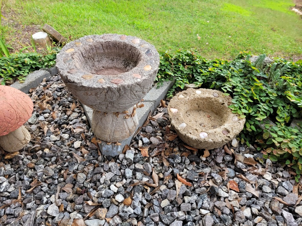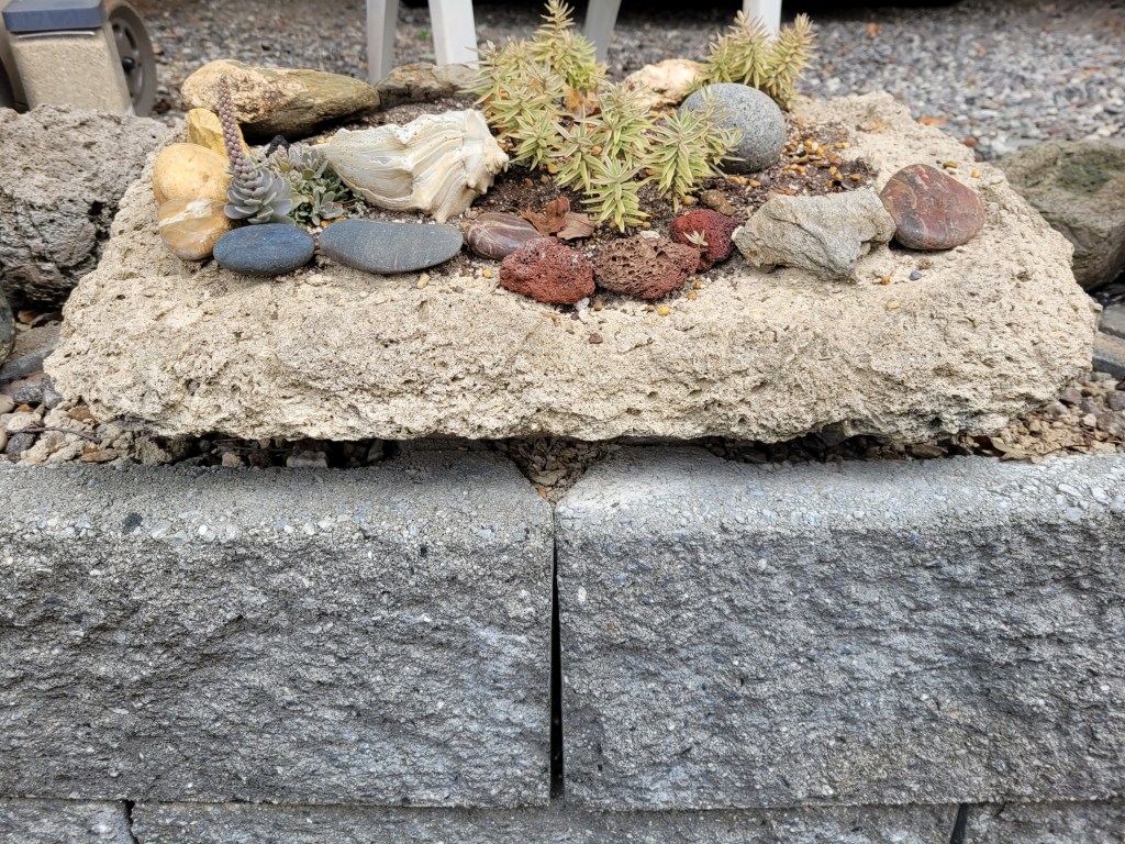 I discovered that there is a fine line between a recipe that will grow moss and a recipe that falls apart. The trick is to use fibers that are made to strengthen concrete. The fibers left sticking out can be burned off using a blow torch. I also used these fibers in bird baths and benches to reinforce them, along with hardware cloth and rebar.