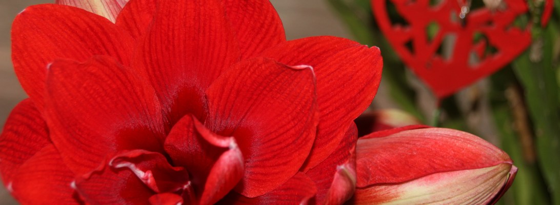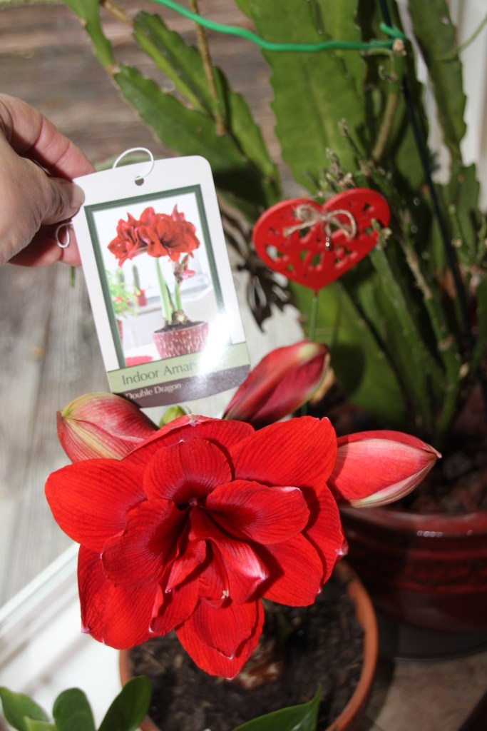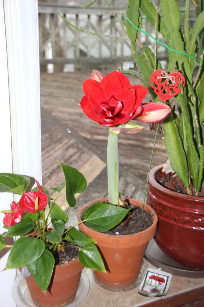 I have lost many of my outside amaryllis bulbs this winter. I am still trying to find the cause. Because of this fact I refused to buy one over the Christmas holidays. I lamented not having a bulb to observe during the cold months, so Mr. Flower found an unsold bulb to rescue for a Valentine’s gift. This one is labeled Indoor Amaryllis, Double Dragon. Its first bloom just opened.