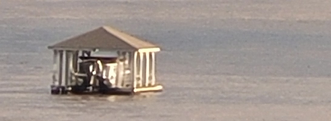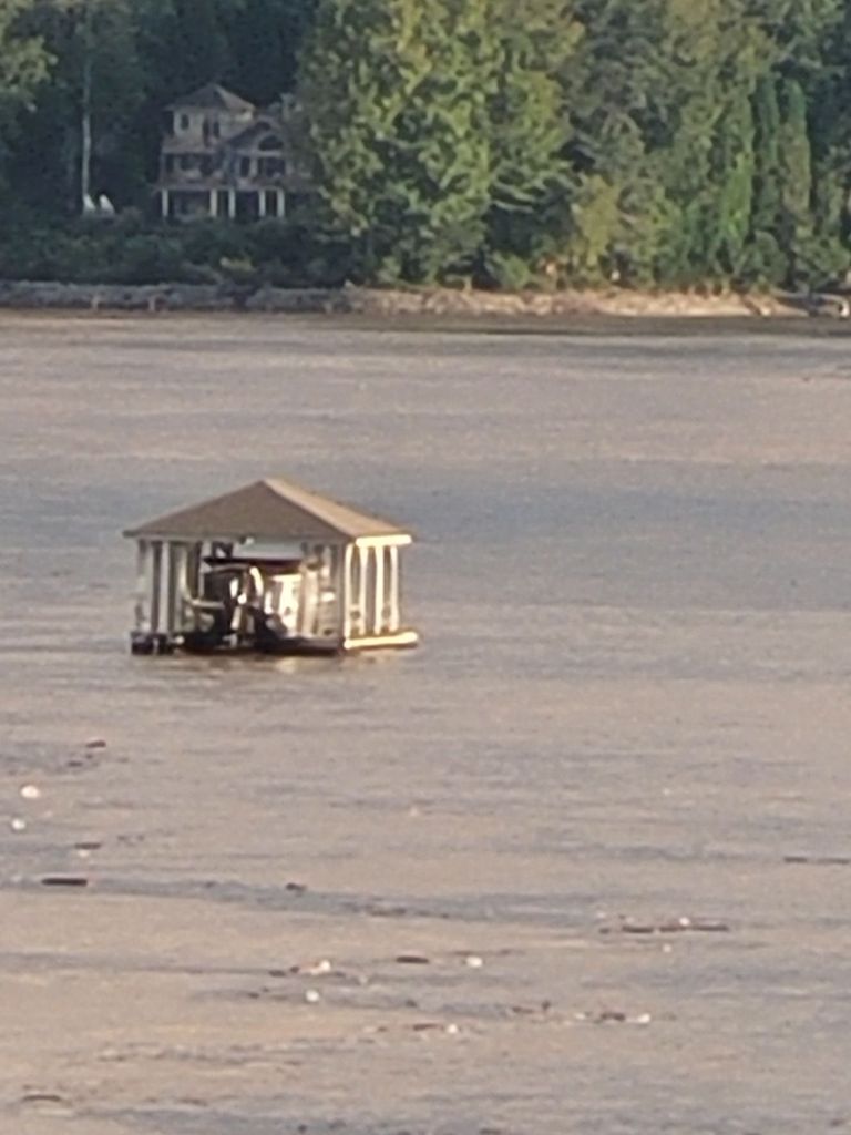 This pontoon came by three times. The island splits the flow of the river. We saw it pass, circle back up river, then get caught in the main current again.