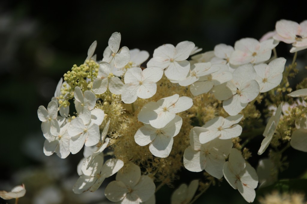 The Oakleaf Hydrangea has blooms about a foot long which blush pink as they age.