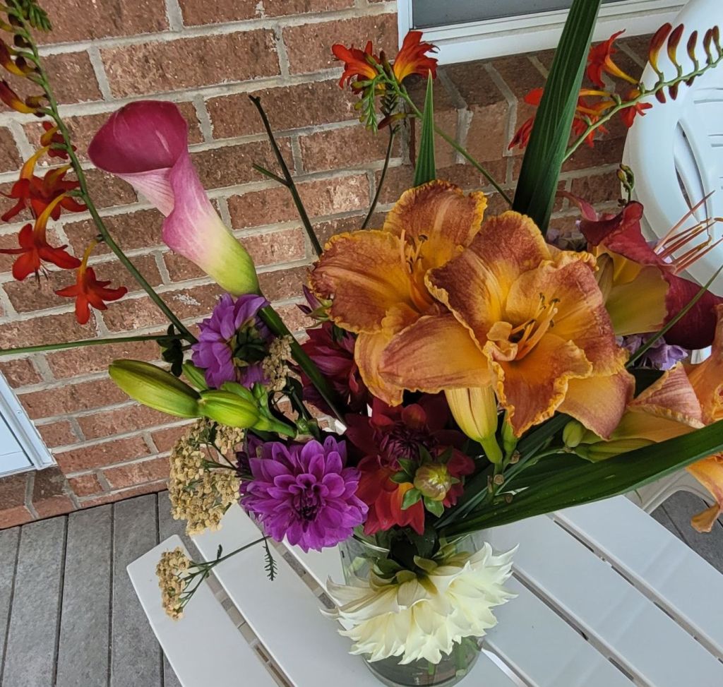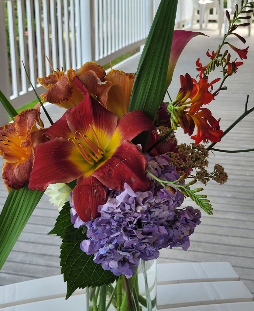 ‘Lucifer’ Crocosmias, Whooperee daylily, ‘Tootie Fruitie’ Yarrow, ‘Firepot’ dahlia, ‘Snow Country’ dahlia, ‘Glory Blue’ Hydrangea, ‘Captain Romance’ calla, ‘Breed Apart’ daylily