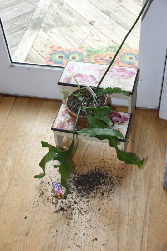 Photo shoot carnage. Positioning leaves lead to a spill. Another mess. I wonder what punishment will be bestowed upon me by my facedown fairy godmother. She’s mean.