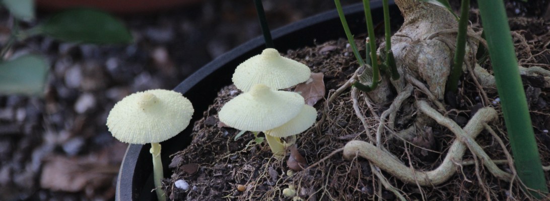 I was so happy to see these tiny mushrooms in the “Hibiscus Circus” pot by my couch.