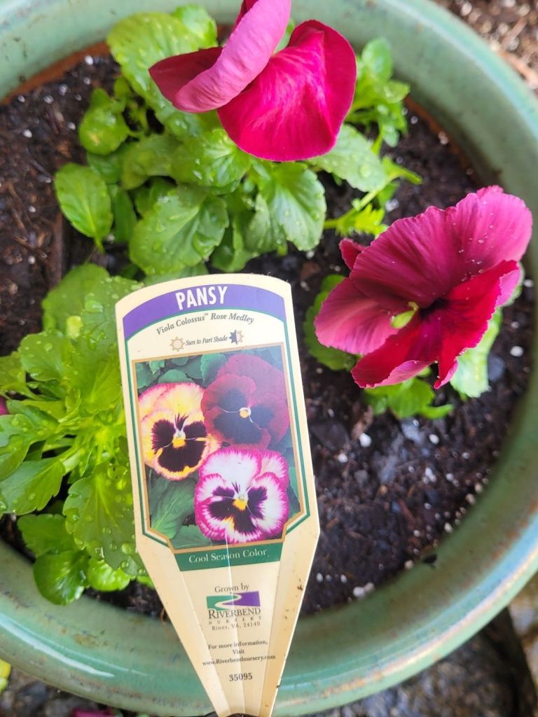 Her pansies had to be pinkish but complicated. I chose Viola Collosus ‘Rose Medley’ and Viola ‘Delta Tapestry.’ Rose Medley got put in a pot this morning.