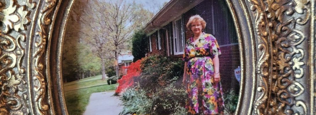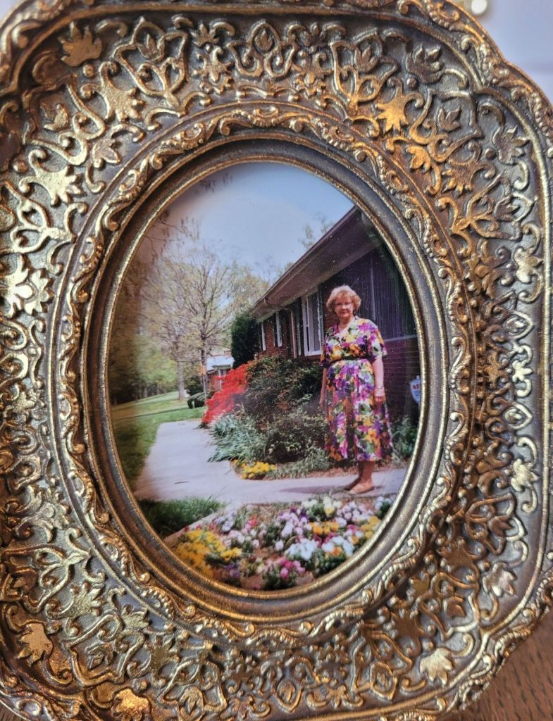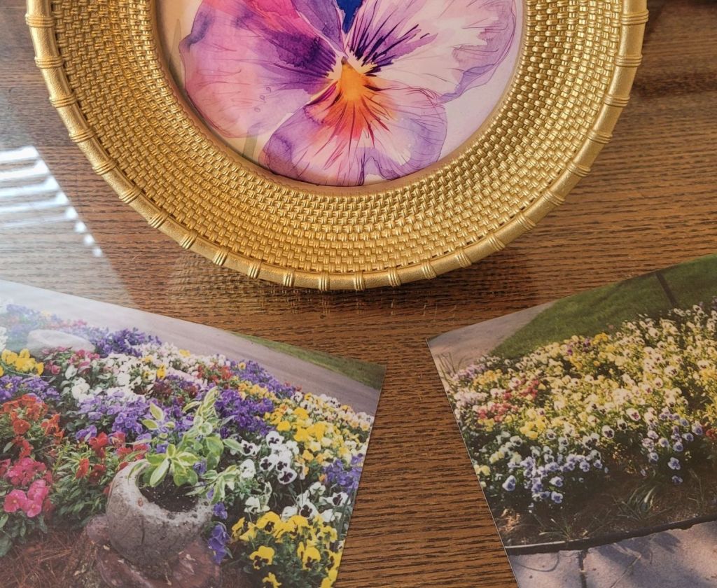 There are pictures of Mama’s pansy bed at Enwood on display. There is a photo of Mama standing by her pansies in a colorful dress.